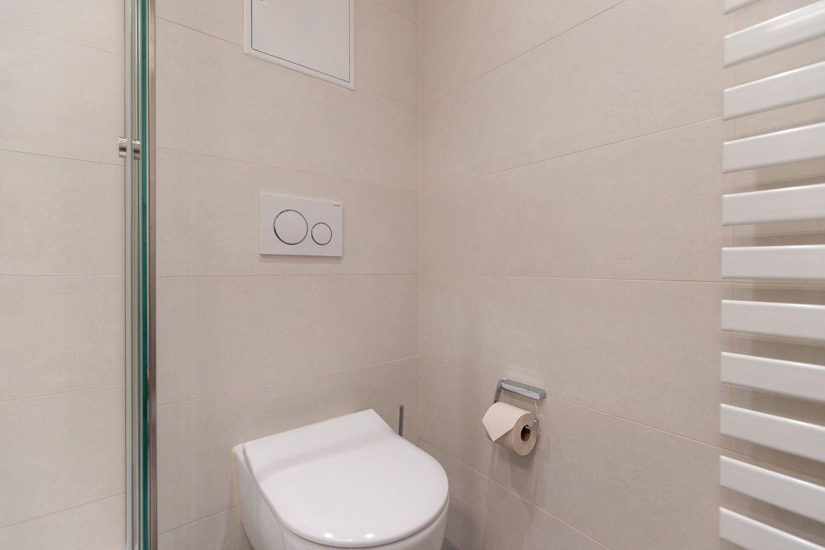 Das 2024 modernisierte Badezimmer verfügt über eine Echtglas-Dusche mit niedrigem Einstieg, Waschbecken mit Unterschrank, großen Wandspiegel, WC, Föhn, Handtuch-Heizkörper sowie ausreichend Ablagemöglichkeiten.