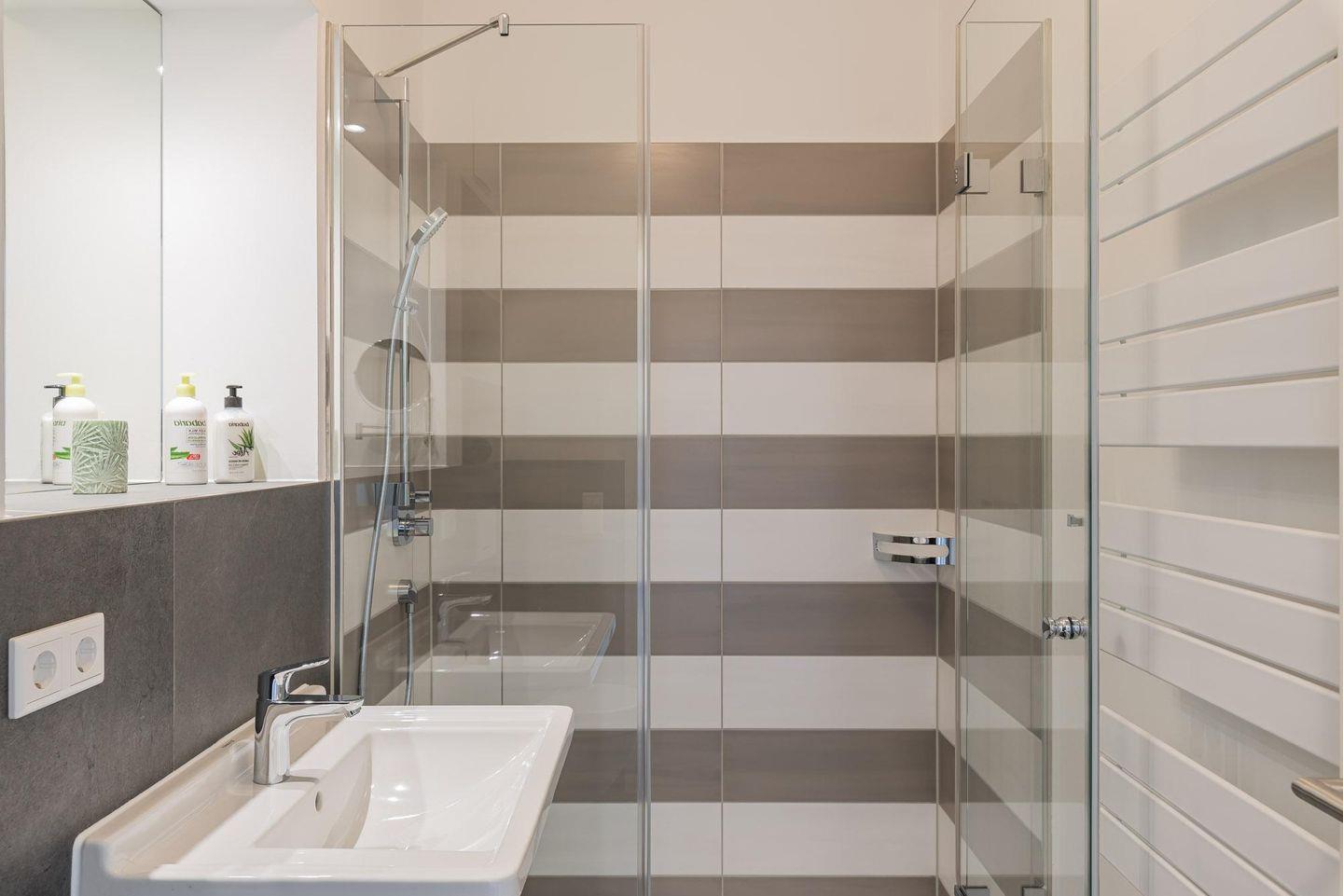 Das Bad verfügt über eine Dusche, einen Haartrockner, einen Handtuchtrockner und