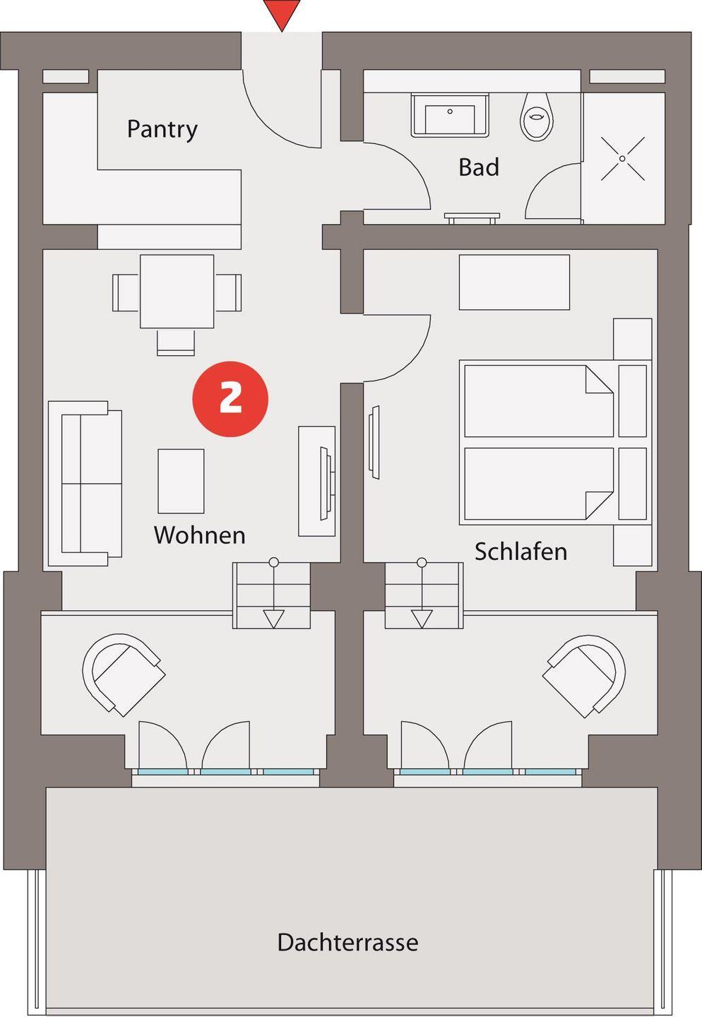Dachterrasse. Diese ist mit Terrassenmöbeln und einem Sonnenschirm sowie einem