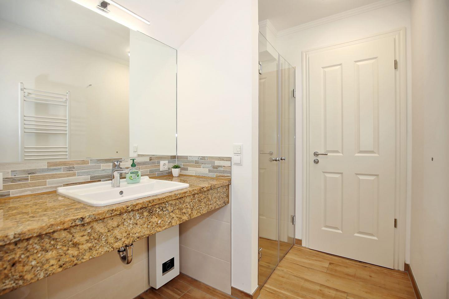Das Tageslichtbad mit ebenerdiger Dusche ist mit einem großzügigen Waschtisch und einem Föhn ausgestattet.