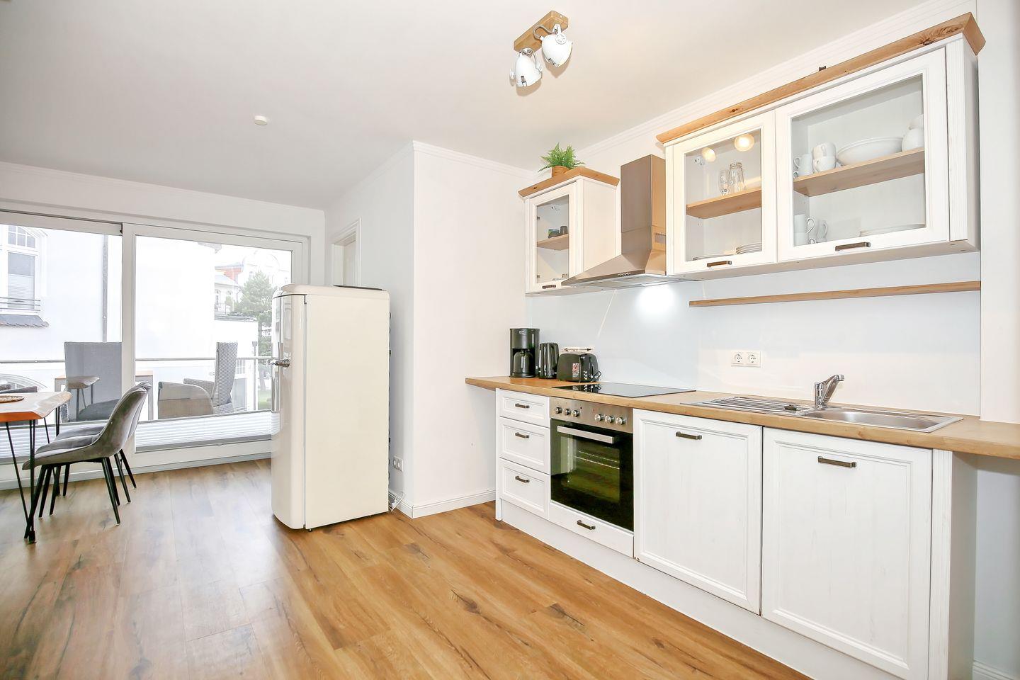 Die angrenzende offene Küchenzeile ist mit einem Kühlschrank mit Gefrierfach, einem Geschirrspüler, einem 4-Platten-Cerankochfeld und einem Backofen voll ausgestattet. Die Küchenausstattung wird komplettiert durch einen Toaster, eine Kaffeemaschine und einen Wasserkocher. Von hier aus hast du ebenfalls einen Blick auf die Ostsee.