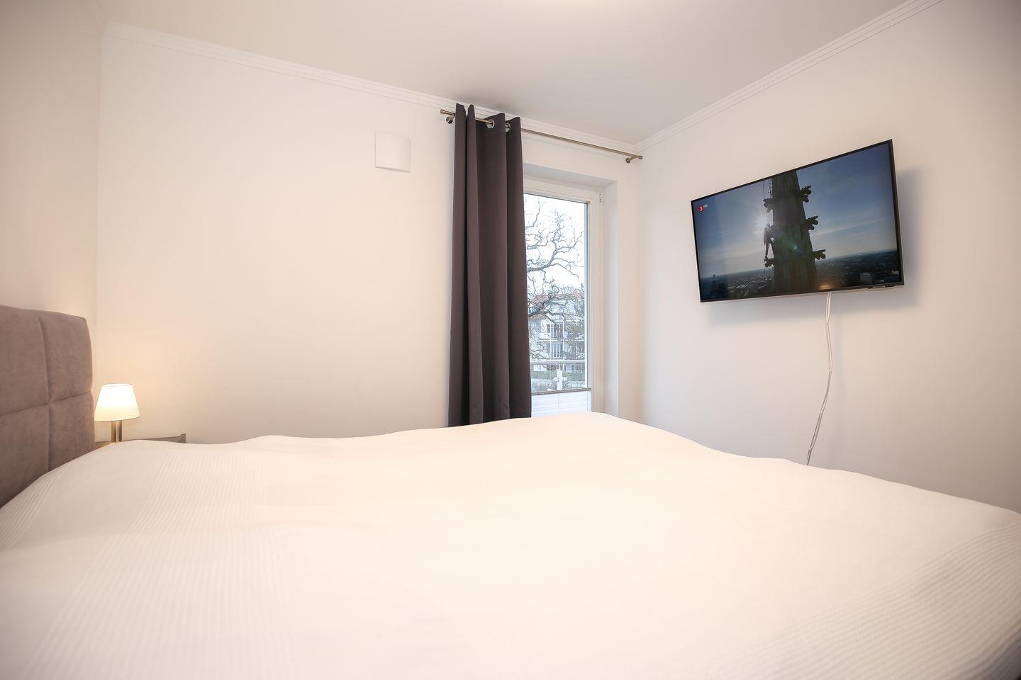 Das Schlafzimmer der Ferienwohnung ist mit einem komfortablen Boxspringbett ( 180 x 200 cm) eingerichtet. Für deine Garderobe bietet der Kleiderschrank ausreichend Stauraum. Zudem erwartet dich hier ein zweiter Flachbild-TV. Zur Verdunklung dienen blickdichte Vorhänge an den Fenstern.