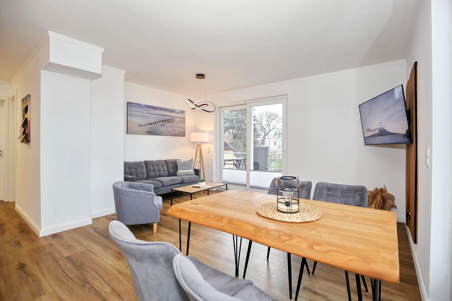 In dieser luxuriösen Ferienwohnung auf ca. 71 m² wird eine hochwertige Ausstattung großgeschrieben. Die moderne 3-Zimmer-Wohnung mit Süd-West-Ausrichtung befindet sich im 1. Obergeschoss der Villa Siegfried und bietet bis zu 3 Personen einen erholsamen Urlaub an der Ostsee – nach nur ca. 50 Metern bist du direkt am Strand. Die Wohnung ist in einen Wohnbereich, einen kombinierten Ess- und Küchenbereich sowie einem Schlafzimmer und einem Tageslichtbad mit Dusche aufgeteilt. Auf dem Balkon kannst du entspannte Stunden mit Blick auf die Ostsee genießen.