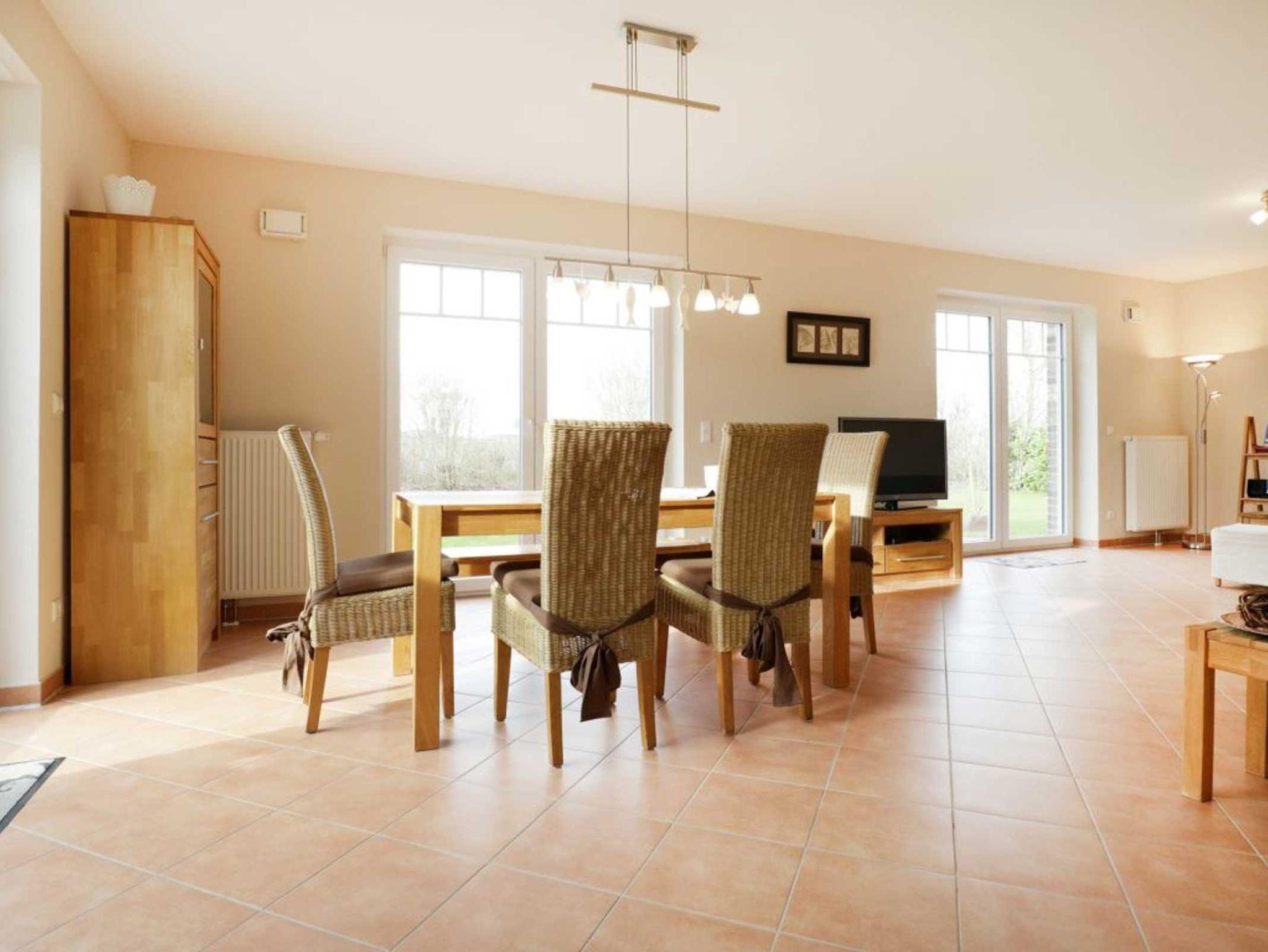 Das stilvoll eingerichtete Ferienhaus bietet mit seinen 110m² genügend Platz zum Erholen für bis zu 6 Personen. Durch die großen Fenster erwarten Sie lichtdurchflutete, helle Räume. Das Wohn-/Esszimmer lässt keine Wünsche offen. Es ist eingerichtet mit einer gemütlichen Sitzecke, einem Fernseher und einem DVD-Player. Die integrierte Einbauküche ist hochwertig mit Geschirrspüler, Herd (Ceranfeld), Backofen, Toaster, Kaffeemaschine u.v.m. Im Hauswirtschaftsraum stehen Ihnen eine Waschmaschine und ein Wäschetrockner zur