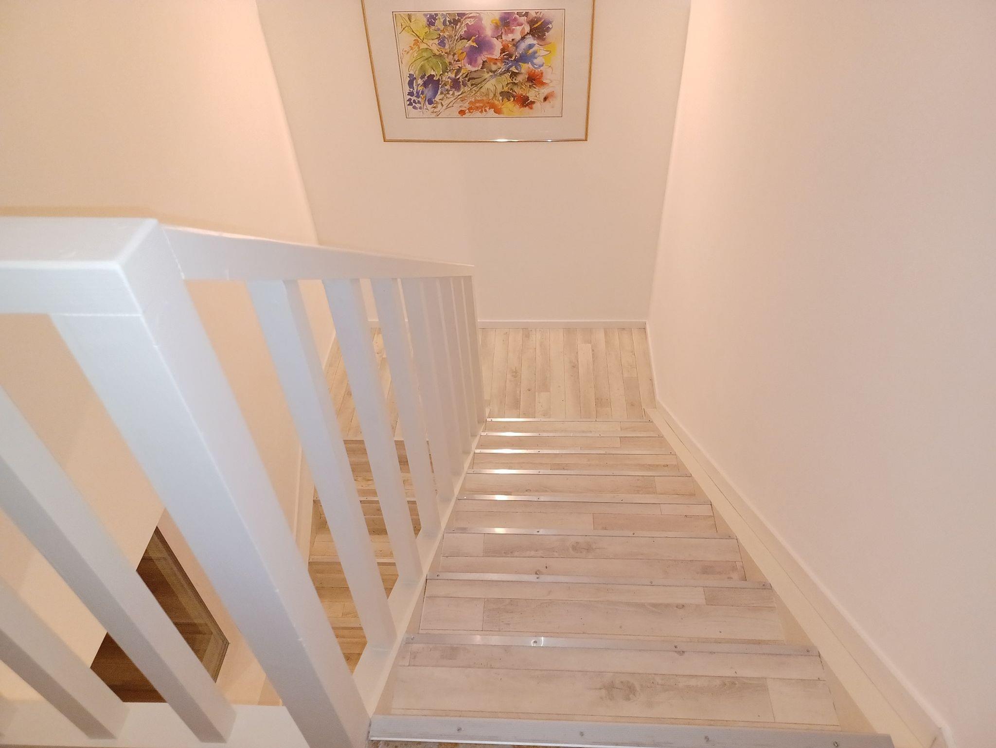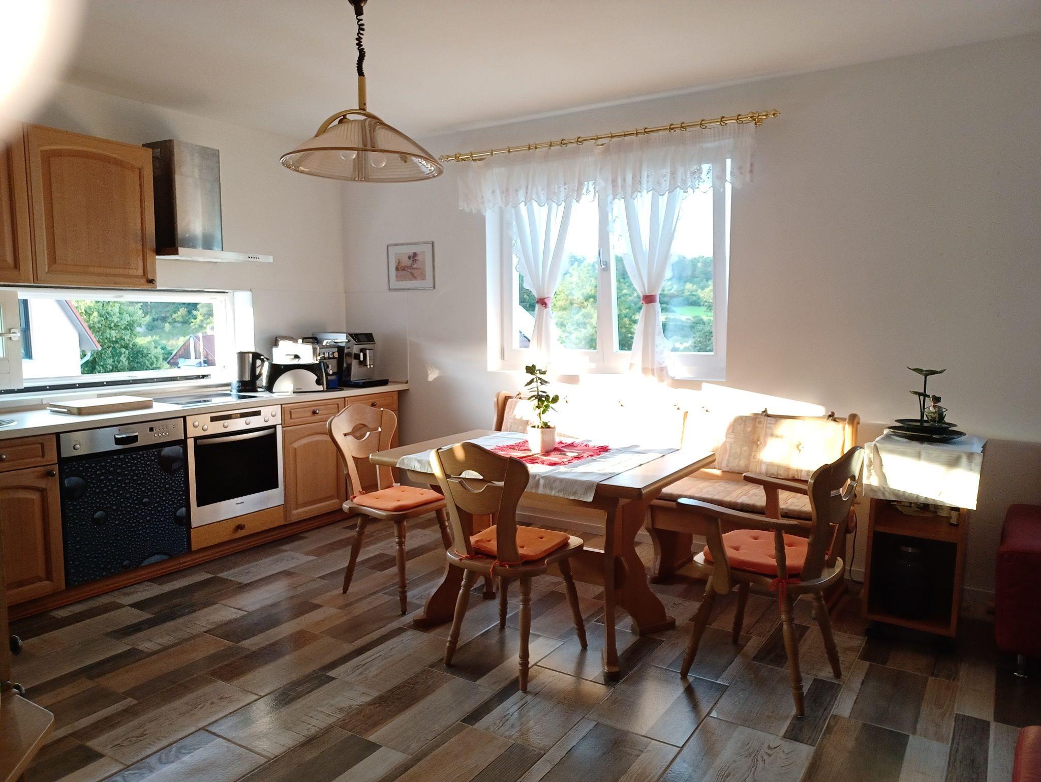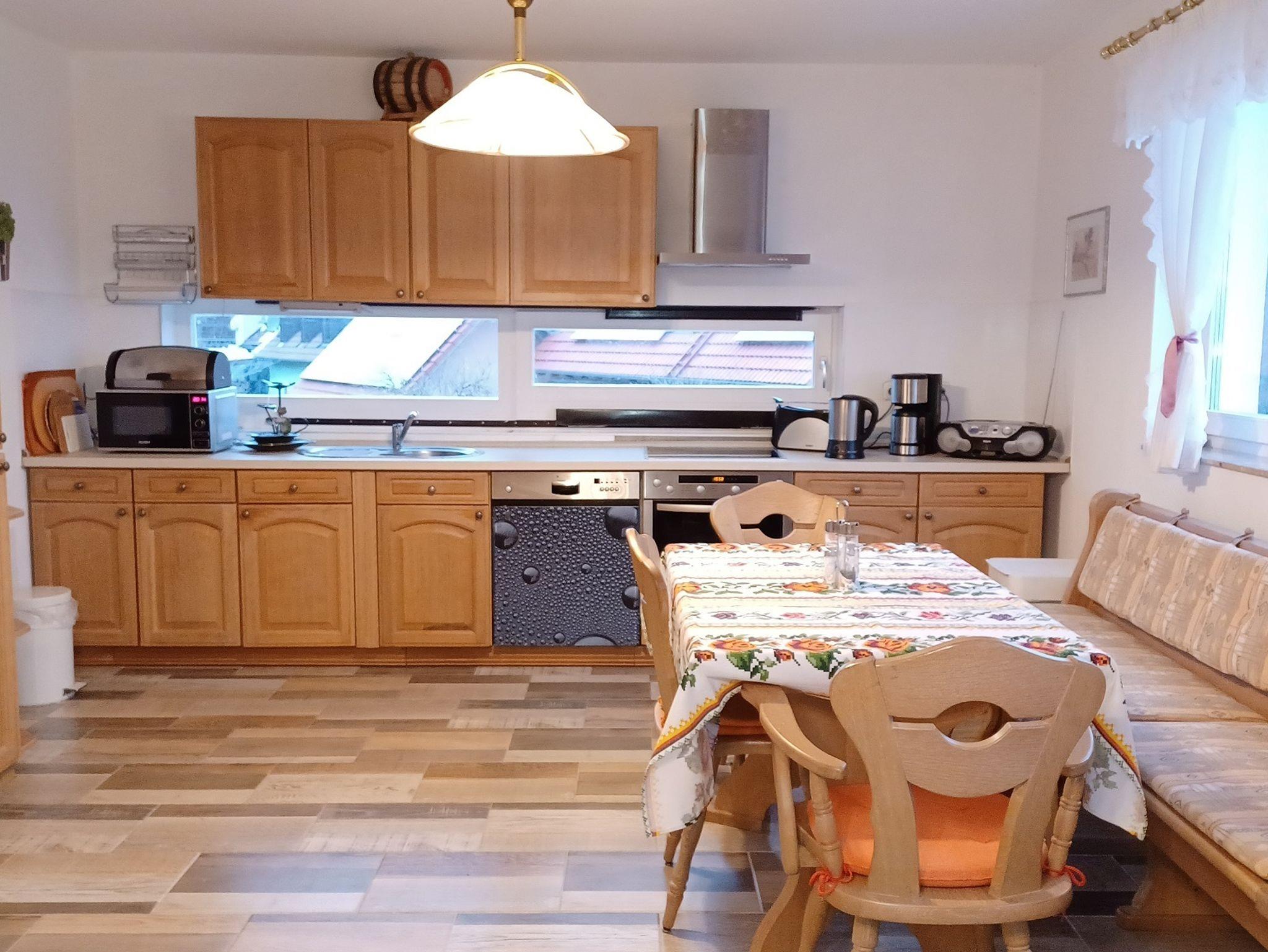Eine Waschmaschine und ein Trockner stehen in der Diele zur Nutzung bereit. Die Ferienwohnung ist zudem ausgestattet mit zwei Bädern und einem einladenden Balkon mit schöner Aussicht auf die Juralandschaft.
