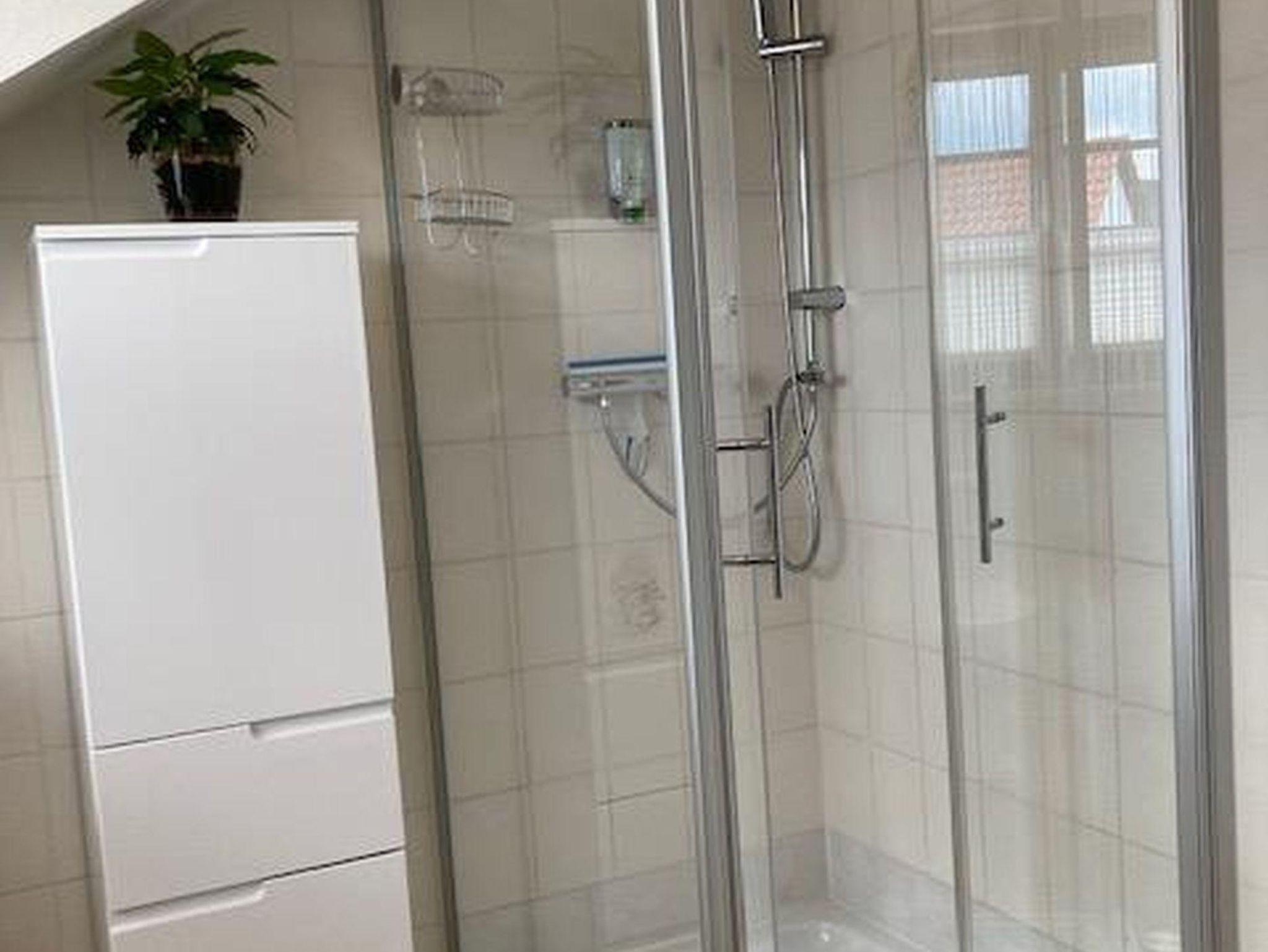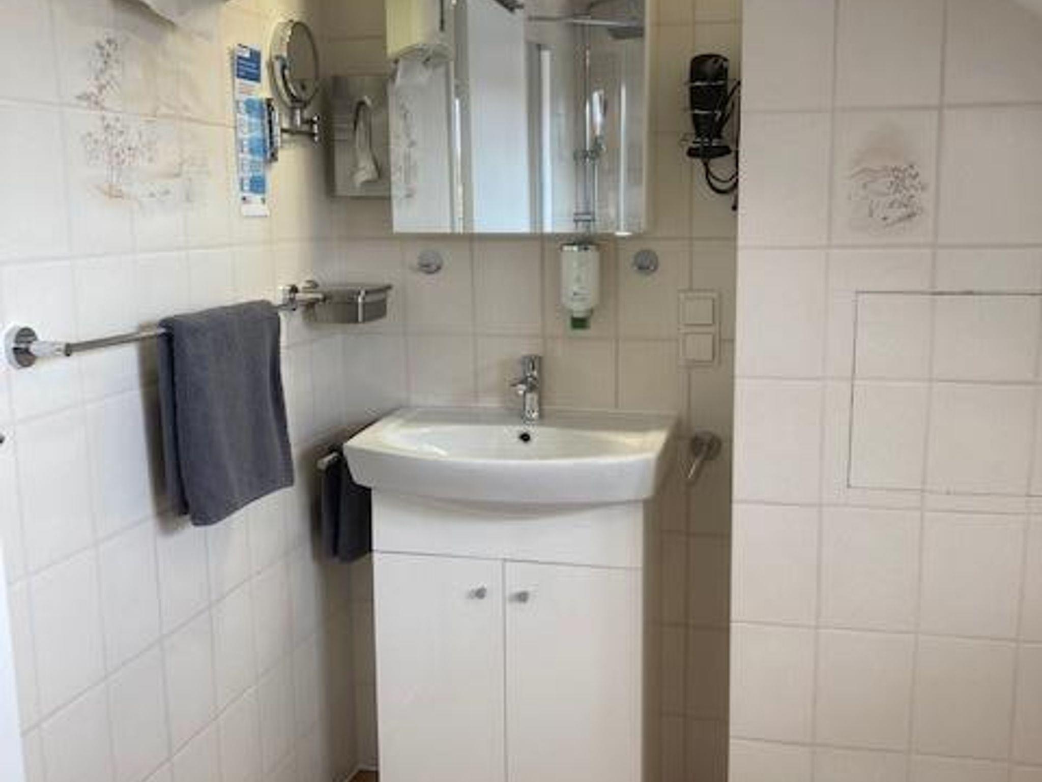 • Badezimmer: Fast ebenerdige Dusche mit Regendusche, WC, Heizkörper und Fußbodenheizung. Waschmaschine, Wäschetrockner, Föhn, beleuchteter Schminkspiegel, Badhocker, Hand- und Badetücher, Pflegeartikel.