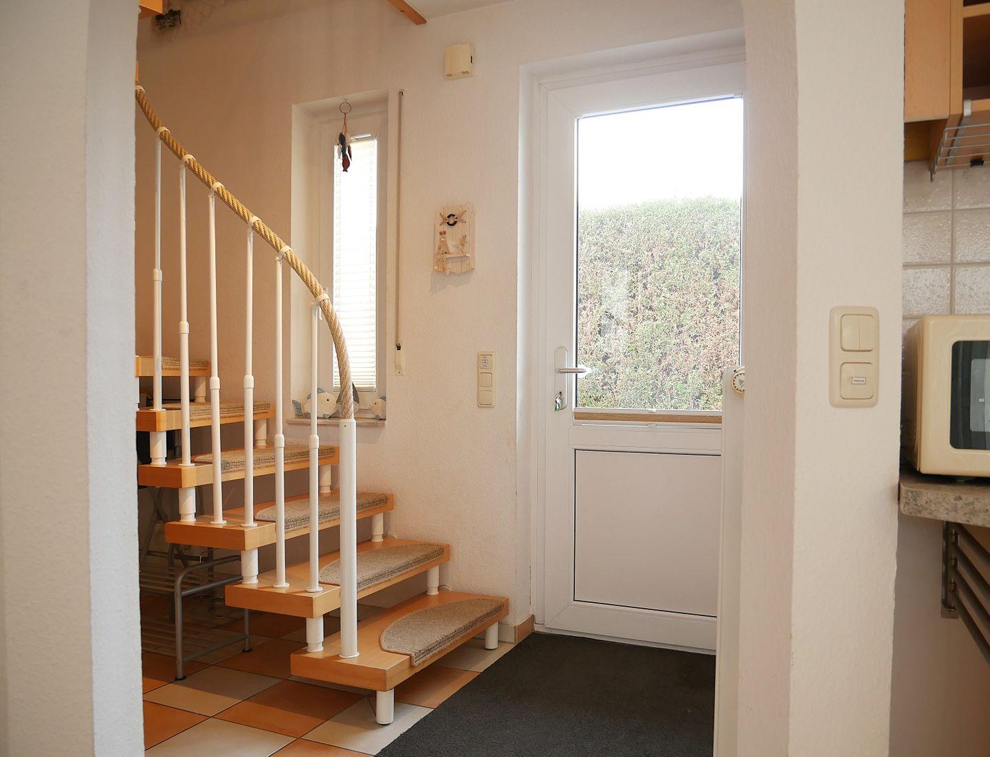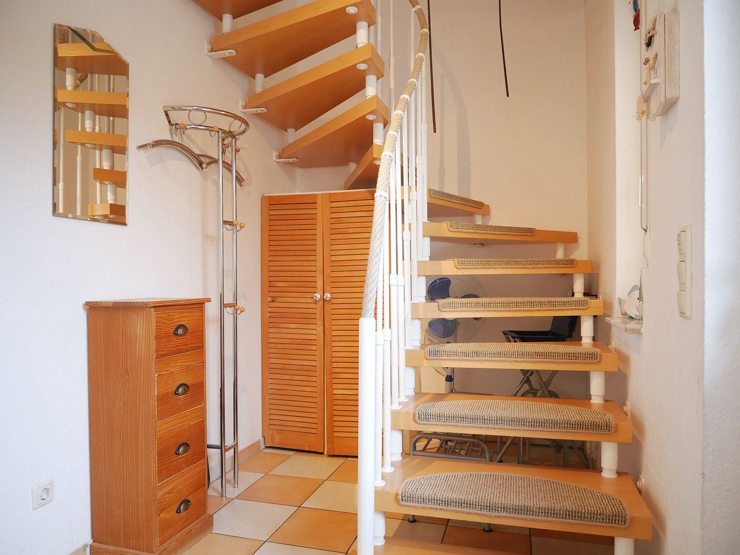 Durch einen Rundbogen gehen Sie in den Flurbereich, wo eine Treppe in das Obergeschoß führt. Hier befinden sich die beiden Schlafzimmer und das Badezimmer.