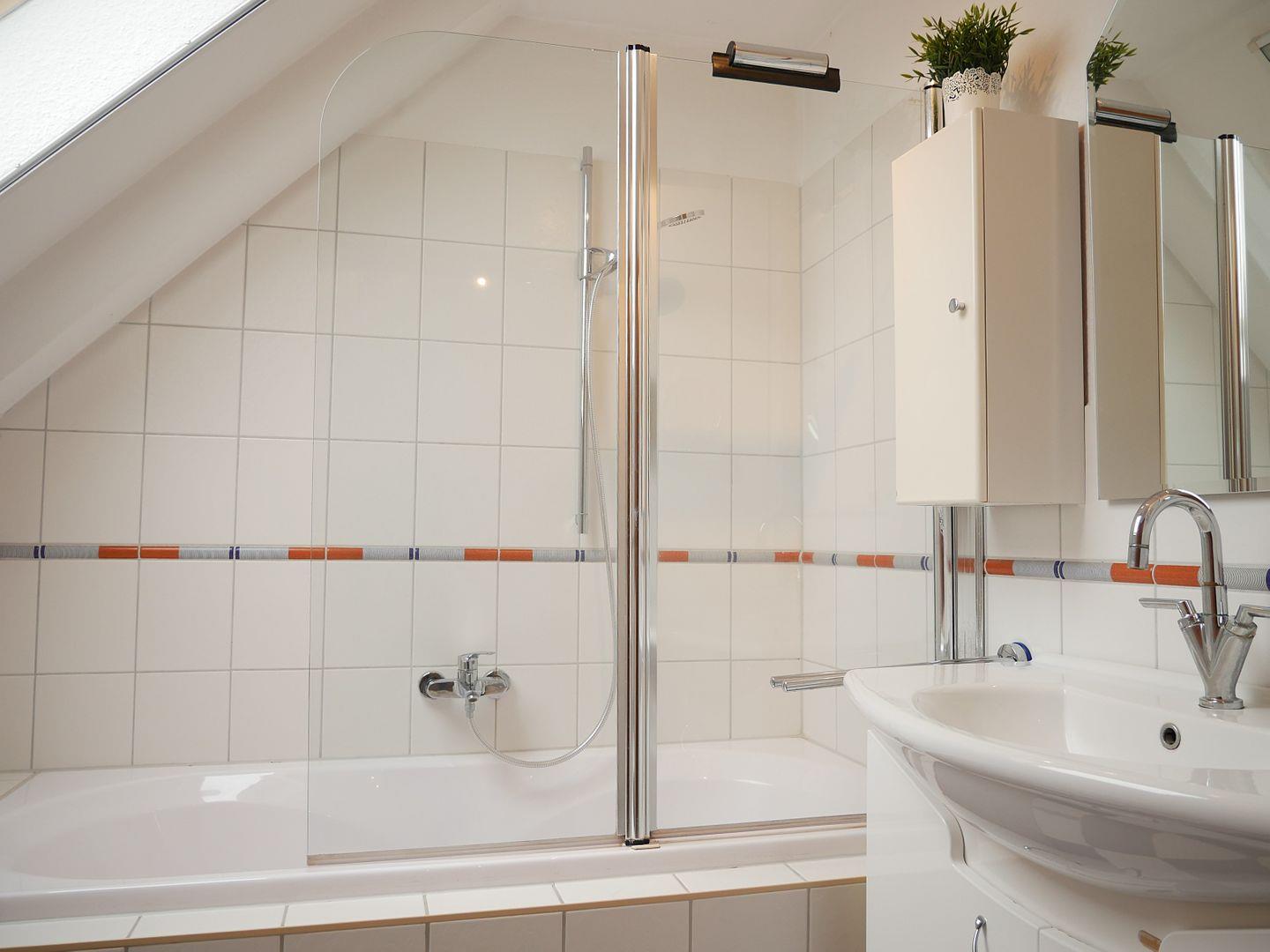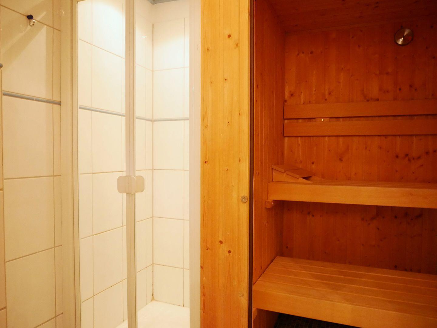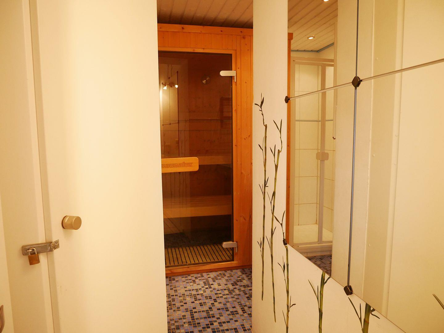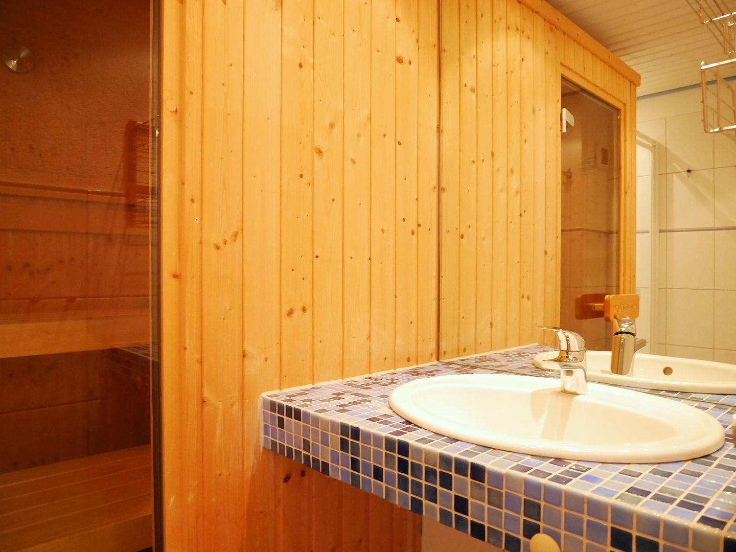 Im Erdgeschoss des Hauses befindet sich außerdem ein Badezimmer mit Waschbecken und Zugang zum Saunabereich, in dem Ihnen eine Dusche und ein weiteres Waschbecken zur Verfügung stehen.