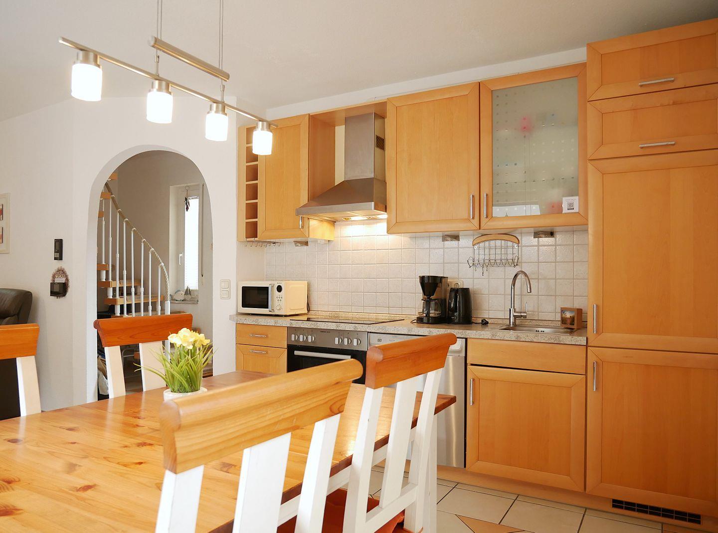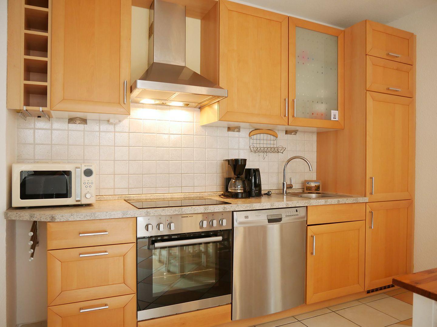 Die Küche ist integriert und komplett eingerichtet mit Ceranfeld-Herd, Backofen, Mikrowellenherd und Geschirrspülmaschine. Auch eine Kaffeemaschine (Filtermaschine und Senseo-Pad-Maschine), ein Toaster, Brotmaschine, Wasserkocher und Kühlschrank mit Gefrierfach sind vorhanden. Geschirr und Besteck sind in ausreichend großer Anzahl vorhanden, ebenso Töpfe, Pfannen und alles andere, was wichtig für eine vollständige Küche ist.