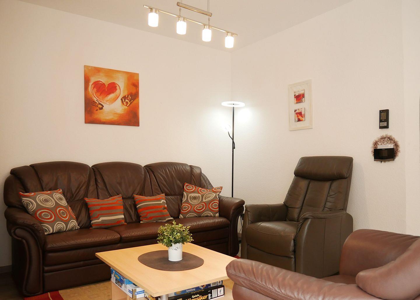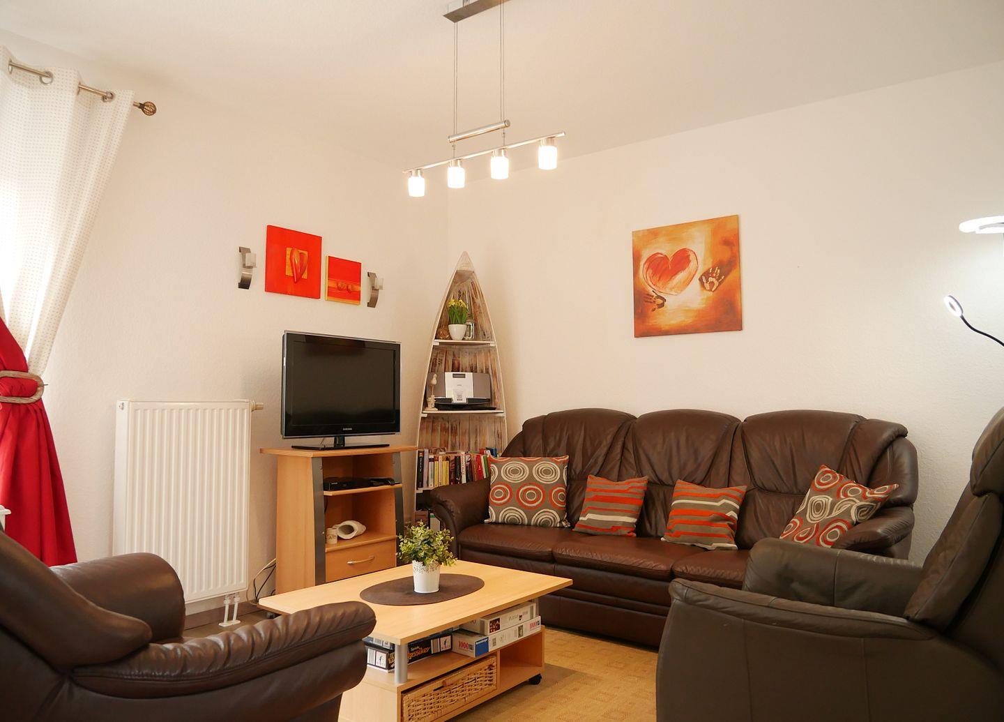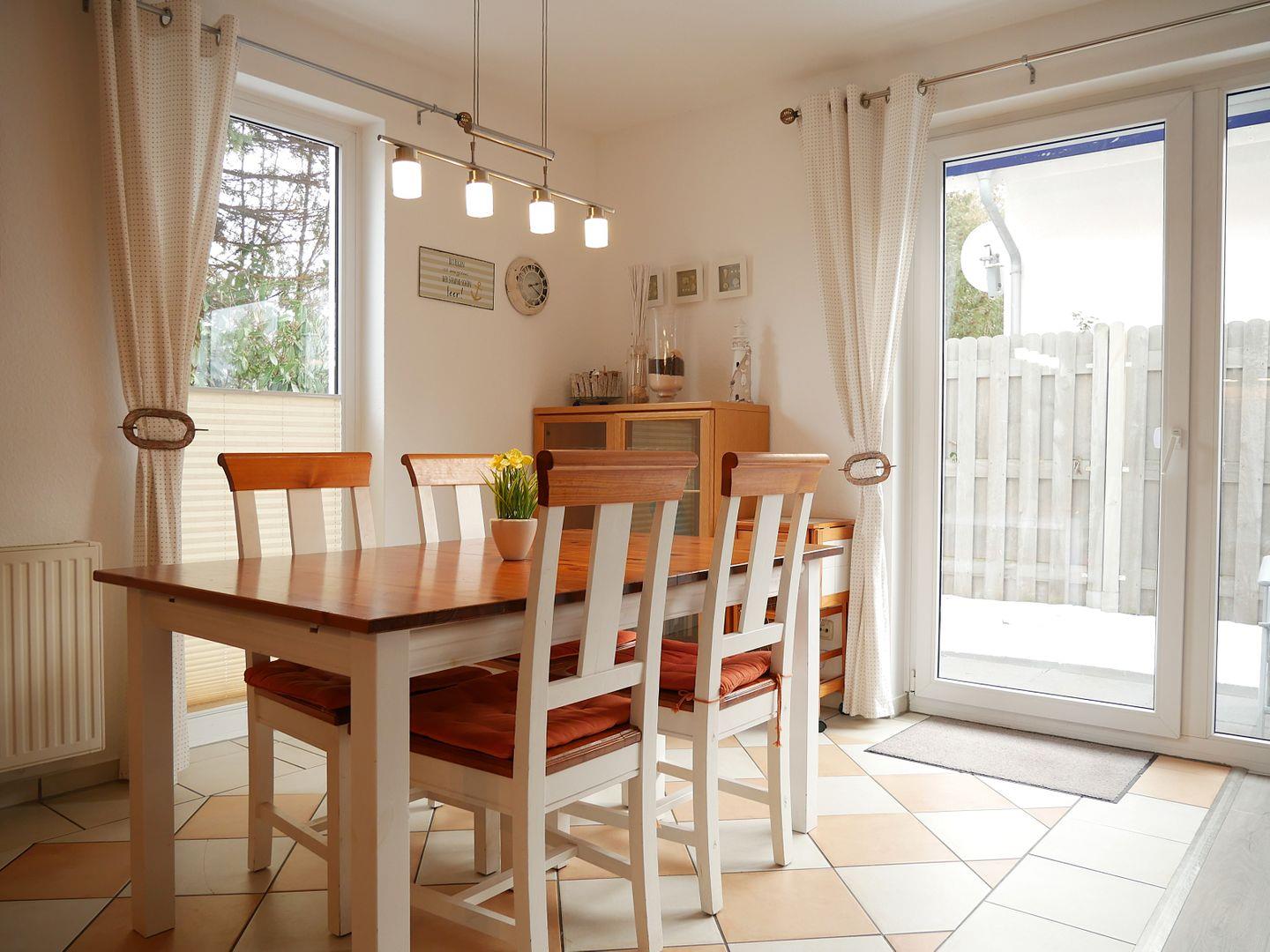 Das kombinierte Wohn- und Esszimmer ist gemütlich und wohnlich mit einer Sofaecke, einem SAT-TV, DVD-Player und Stereoanlage eingerichtet. An dem großzügigen, massivem Esstisch aus Holz haben alle Gäste genügend Platz. Zur Terrasse haben Sie einen direkten Zugang vom Wohnbereich aus.