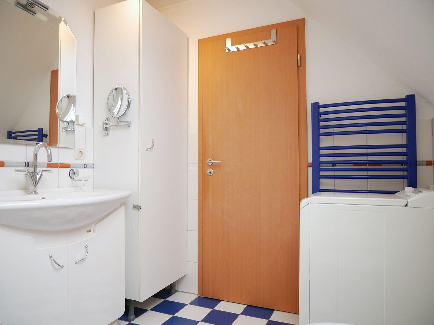 Das moderne Badezimmer ist mit einer Badewanne mit Whirlpoolfunktion, Waschtisch, WC und Waschmaschine ausgestattet.