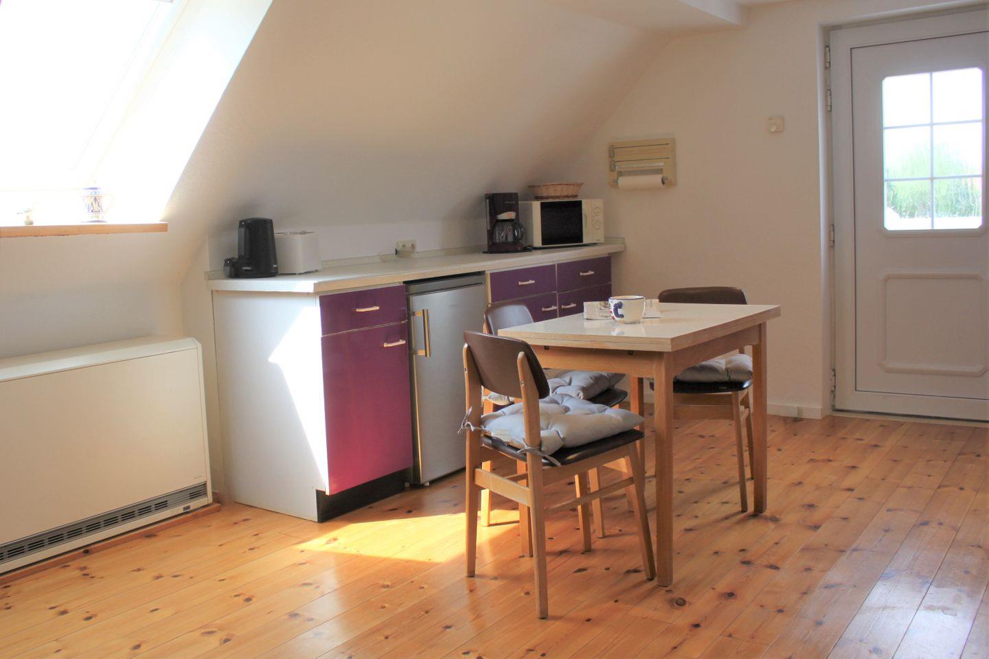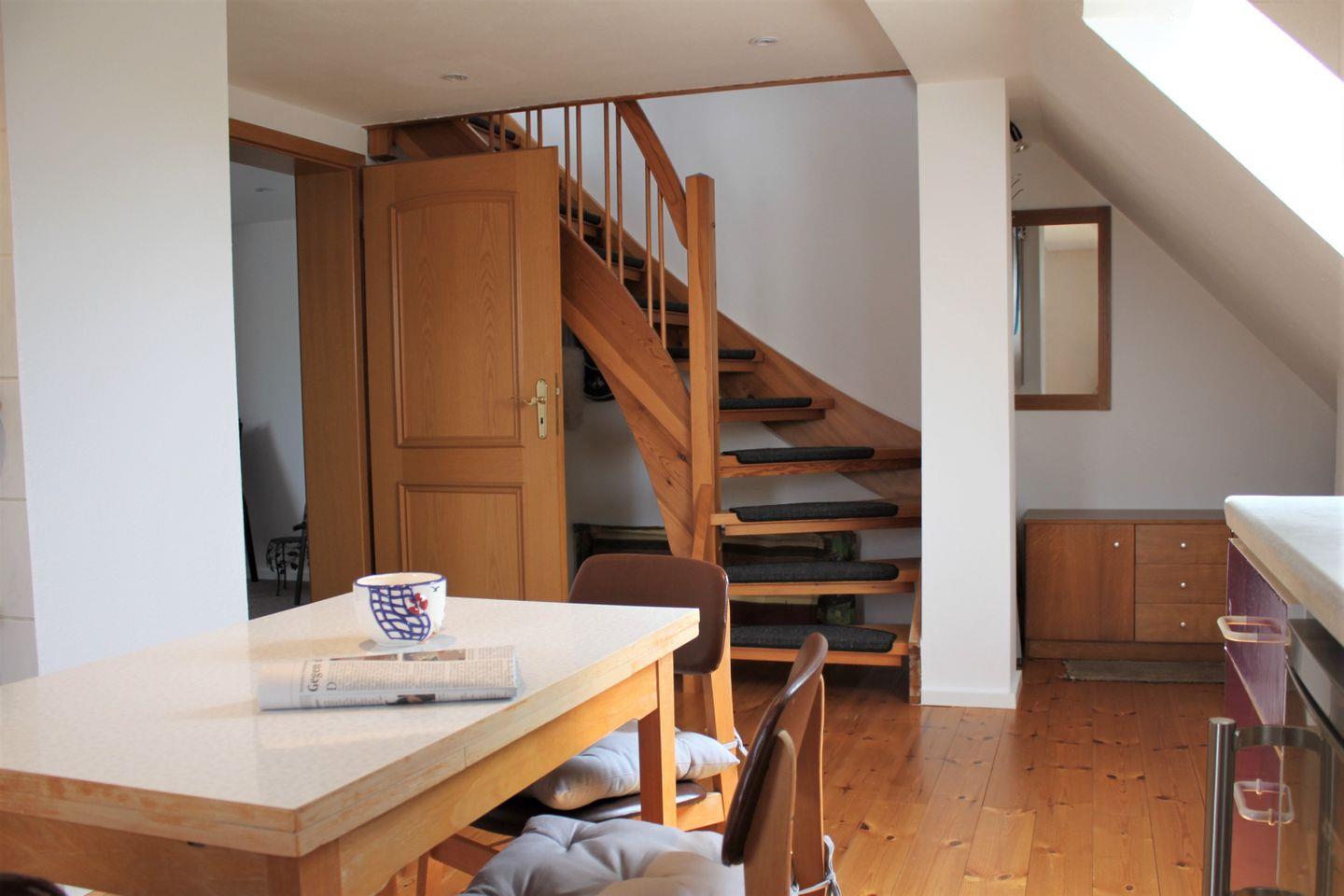 Diese ca. 70qm große, helle Maisonette-Ferienwohnung befindet sich in einem Einfamilienhaus und ist über eine Außentreppe erreichbar. Die Wohnung ist charmant und gemütlich eingerichtet und bietet Ihnen neben einem Wohnzimmer mit Couch, TV-Gerät und WLAN, eine großzügige Wohnküche mit Esstisch und vielen technischen Geräten. Dazu gehören zum Beispiel ein Kühlschrank, eine Mikrowelle, Herd mit Backofen, Kaffeemaschine, Wasserkocher, Toaster und einiges mehr.