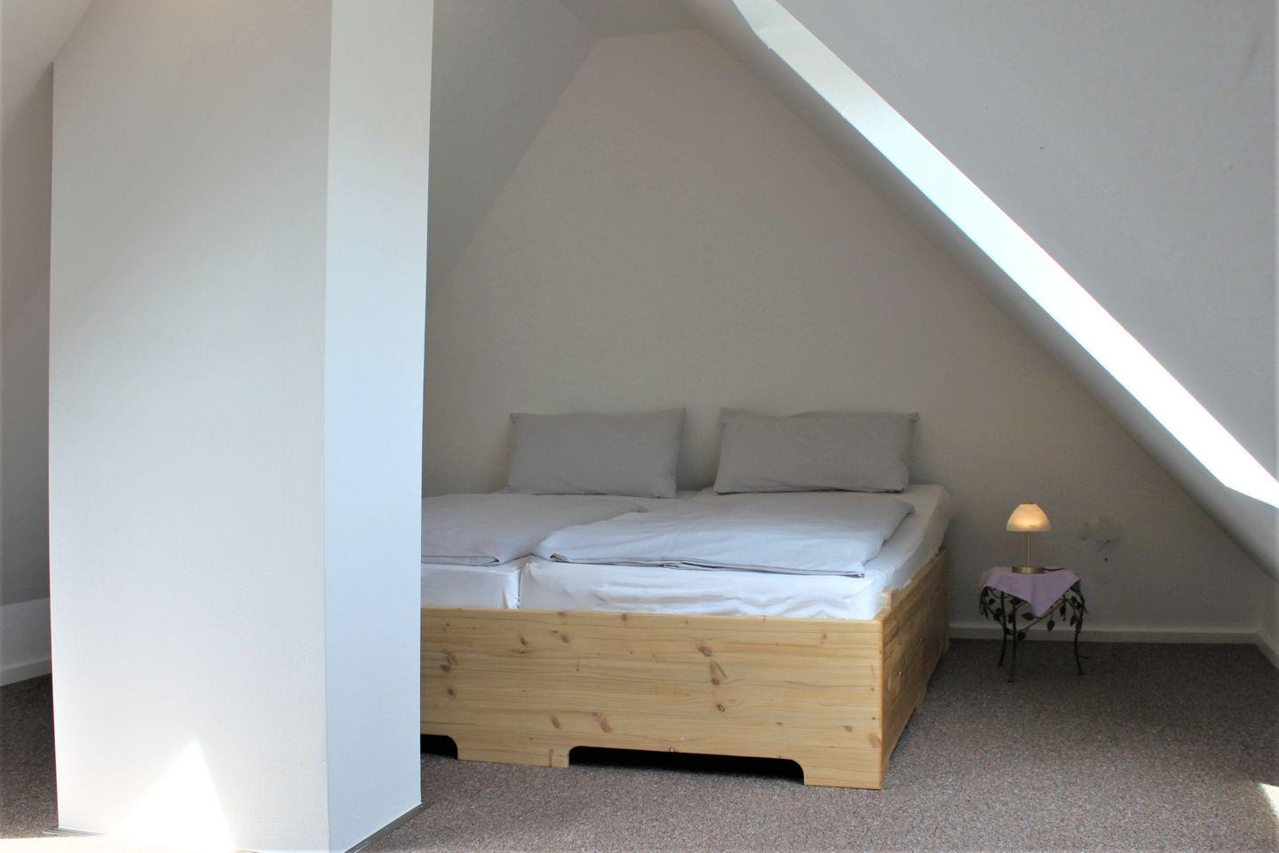 Über eine Treppe gelangen Sie in das Obergeschoss der Wohnung. Hier befindet sich das gemütliche Schlafzimmer mit zwei Dachfenstern und einem Einbauschrank für Ihre Garderobe.
