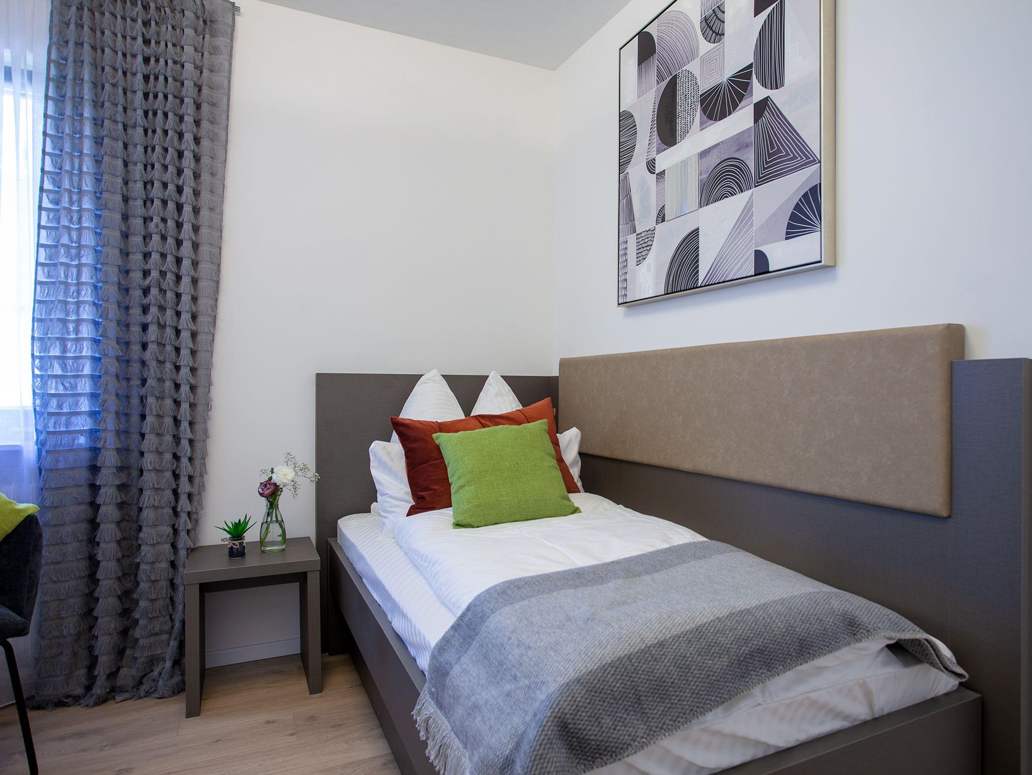 Zudem verfügen alle Wohnungen über ein, geräumiges Wohnzimmer und ein eigenes Bad mit Dusche.