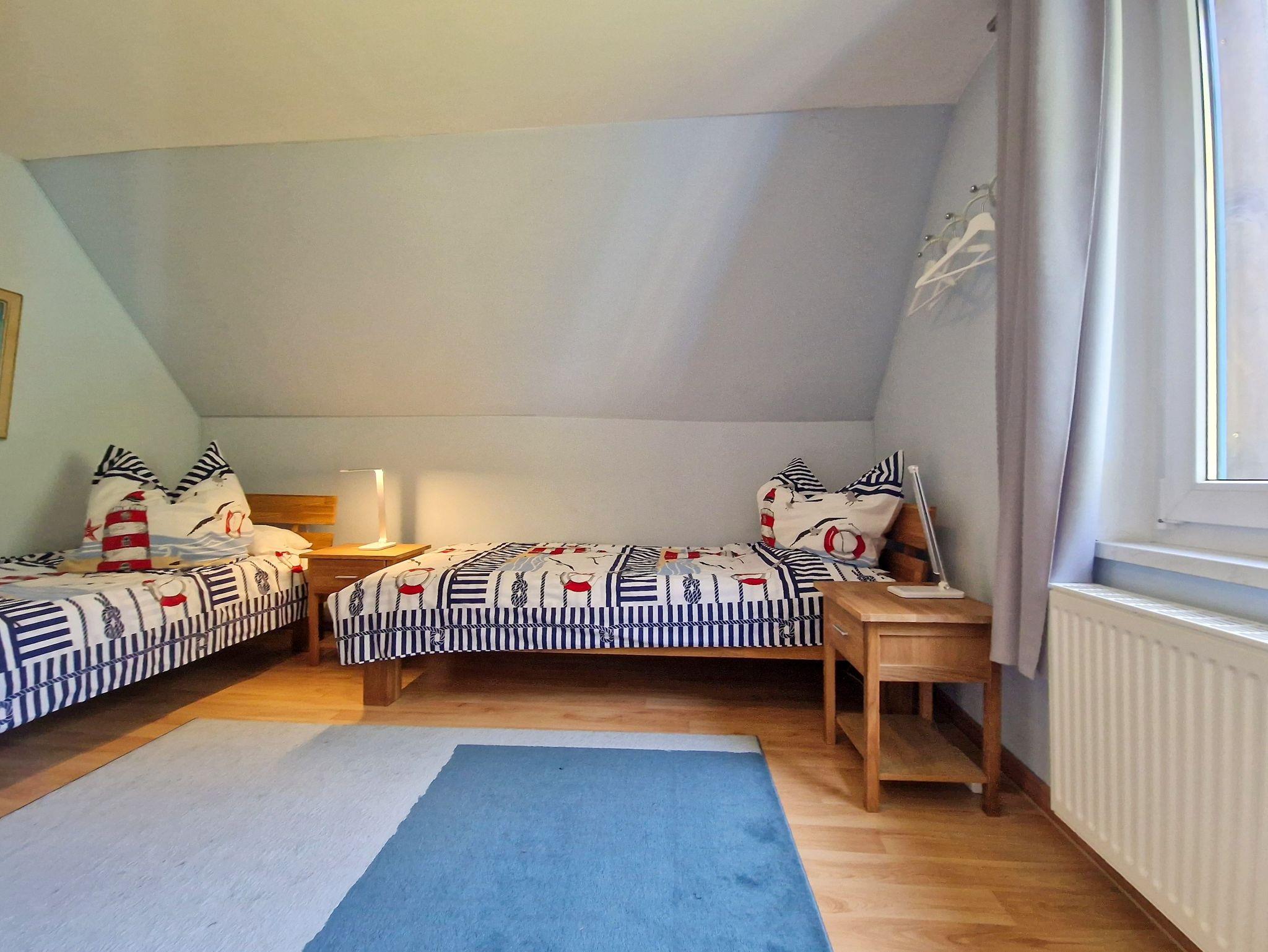 Das „Blaue Zimmer“ (18 qm) ist eine separate, abgeschlossene ?Wohnung? im Nachbargebäude für bis zu 2 Personen: Schlafzimmer mit Doppelzimmer und eigenem Bad (mit Dusche + WC). Dieses wird als „Aufbettung“ ab 4 Erwachsene hinzugebucht.