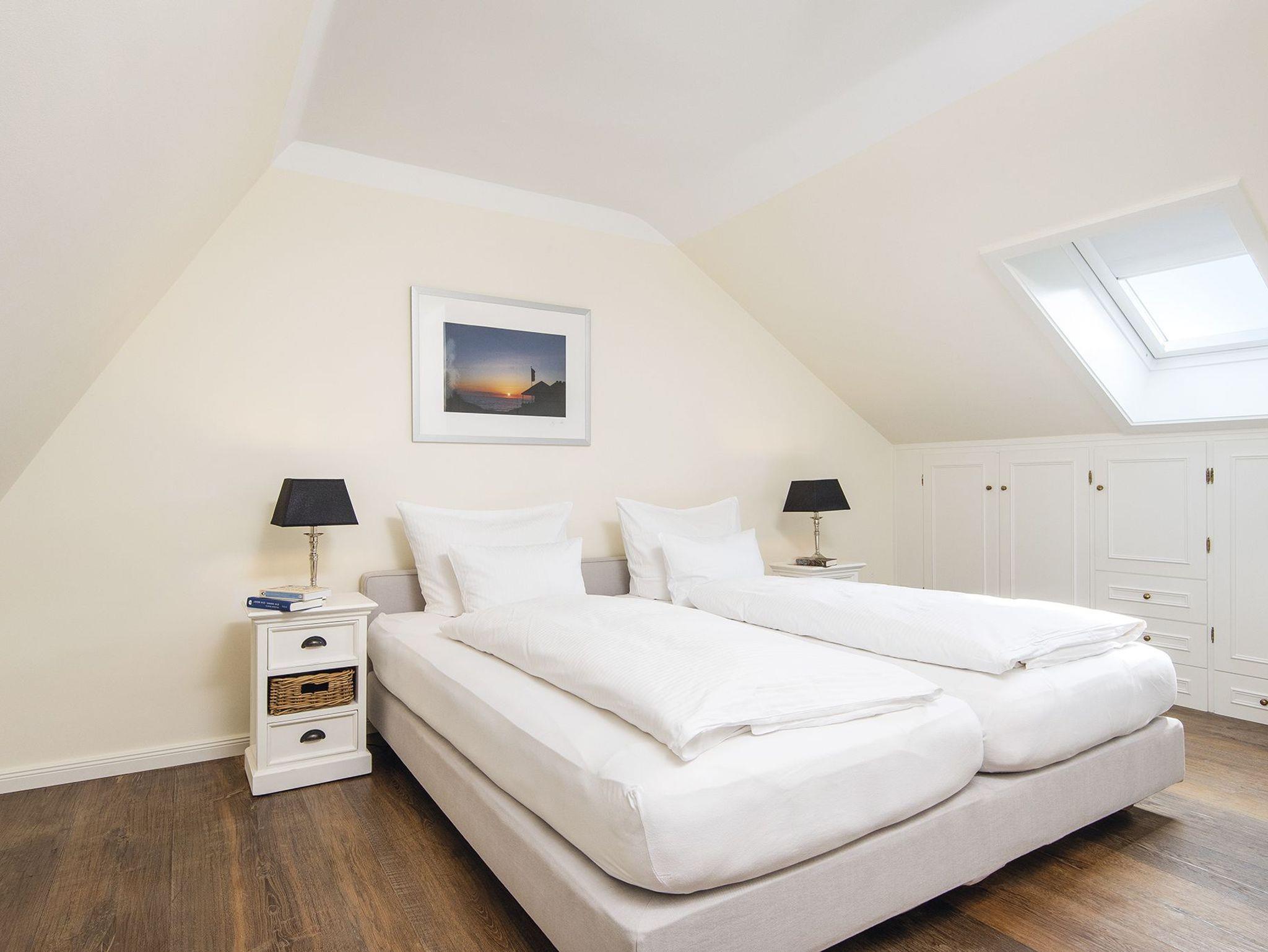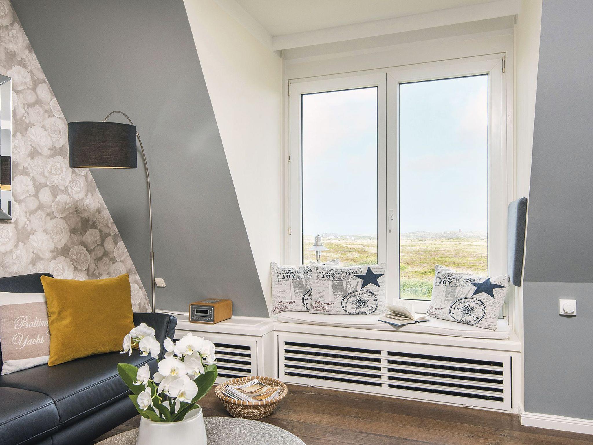 Ein Traumblick gleich über beide Meere bis zum Quermarkenfeuer und weiter hoch in den Norden über das Wattenmeer nach List bietet sich aus dem tiefen, von Sitzkissen gesäumten Panoramafenster des Wohnzimmers. Der große Vorzug des Appartementhauses Kampbarg ist seine Lage in der Kurhausstraße, im Herzen des renommierten Dorfes. Die Wohnung Nummer 36 liegt im ersten Stock und ist hochwertig, modern und originell eingerichtet. Neben dem Wohnzimmer befindet sich auf dieser Ebene zudem eine kleine separate Küche und ein Duschwannenbad unter der Schräge. Eine schmale Treppe führt hinauf in das behagliche und hochwertig eingerichtete Doppelschlafzimmer und hat einen traumhaften Blick durch das Dachfenster in den Sternenhimmel.