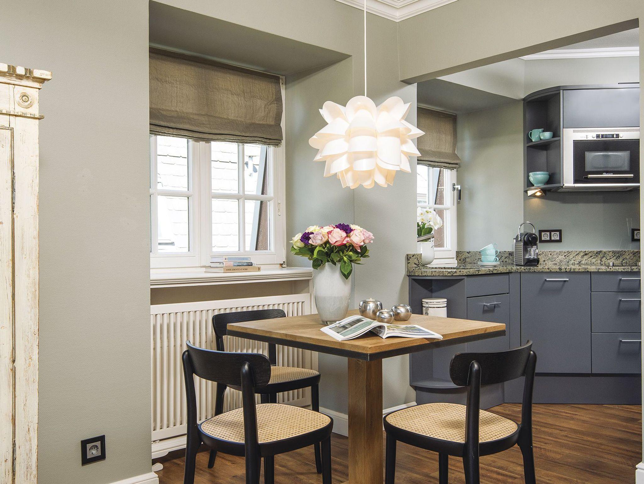 Ein frisch renoviertes, elegantes Quartier für Drei erwartet Sie hier im 1. Obergeschoss eines gediegenen Appartementhauses auf der Kurhausstraße. Durch einen kleinen Flur gelangen Sie direkt in den Wohnbereich mit schönem Ecksofa, offener Küche und Esstisch in eleganten Grau- und Sandtönen. Ebenso gelangen Sie von hier auf den überdachten Balkon mit herrlich weitem Blick nach Süden über die Uwe Düne hinweg. Über eine Treppe vom Flur aus finden Sie im 2. Obergeschoss mit flauschigem Teppichboden ein Doppelschlafzimmer mit 1,60m breitem Bett und ein gemütliches Einzelzimmer, sowie ein Duschbad. Sie surfen hier mit bis zu 250 MBit/s. Ein Quartier in perfekter Kampen-Lage, wohnlich und elegant eingerichtet, für schöne Urlaubstage bei jedem Wetter.