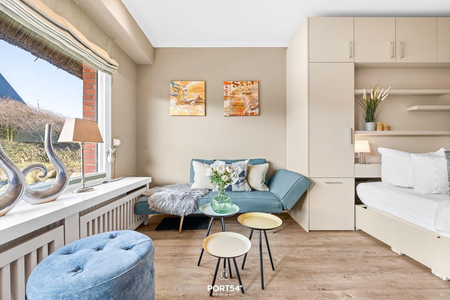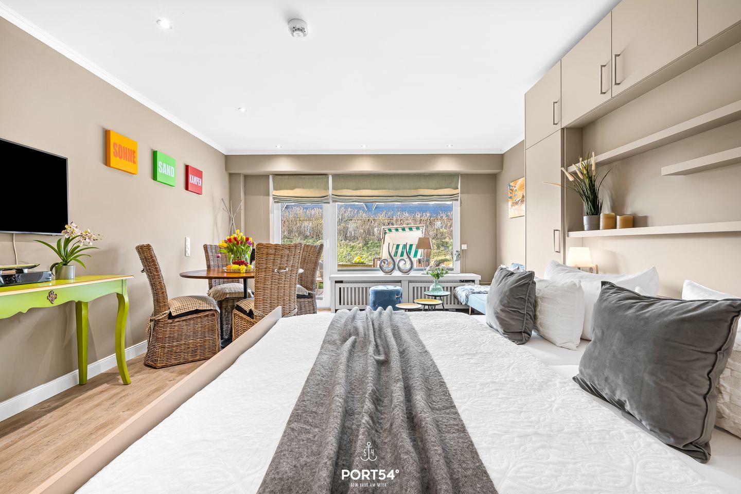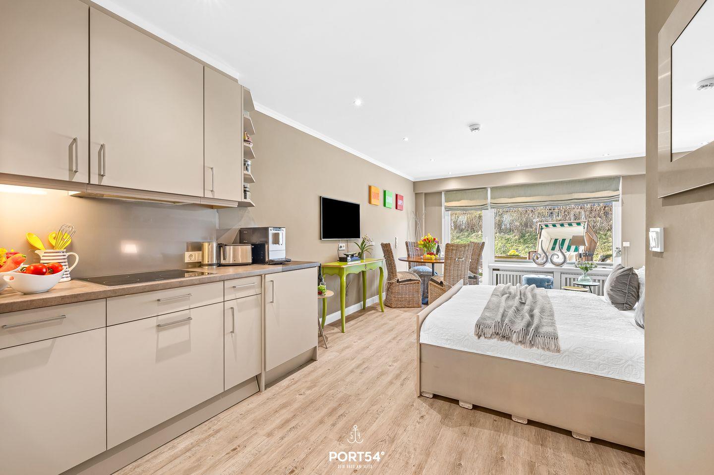 Das Studio-Appartement „Lieblingsplatz am Meer No. 2“ im charmanten Reetdachhaus Haus Kampbarg begrüßt dich in bester Lage von Kampen auf Sylt. Komplett renoviert, stilvoll eingerichtet und mit viel Feingefühl gestaltet, bietet dieses Feriendomizil auf kleiner, aber perfekt genutzter Fläche einen modernen, behaglichen Rückzugsort für zwei Personen, die Wert auf Komfort, Qualität und eine strandnahe Lage legen. Schon beim Betreten spürst du die besondere Atmosphäre des Studios: Ein harmonisches Farbkonzept, moderne Materialien und eine durchdachte Raumaufteilung schaffen ein Wohngefühl, das gleichermaßen gemütlich wie funktional ist. Das einladende Doppelbett lässt sich tagsüber mühelos verstauen und eröffnet damit großzügigen Wohnraum. Die separate Couch bietet auch tagsüber einen komfortablen Sitzplatz, ideal zum Lesen, Entspannen oder für gemütliche Stunden am Abend. Der runde Esstisch direkt am Fenster schafft einen hellen Ort für gemeinsame Mahlzeiten, Frühstück oder als ruhige Ecke zum Arbeiten. Der moderne Fernseher ist so platziert, dass er von allen Sitzbereichen und dem Bett aus einsehbar ist – perfekt für abwechslungsreiche Unterhaltung ganz nach deinem Geschmack.