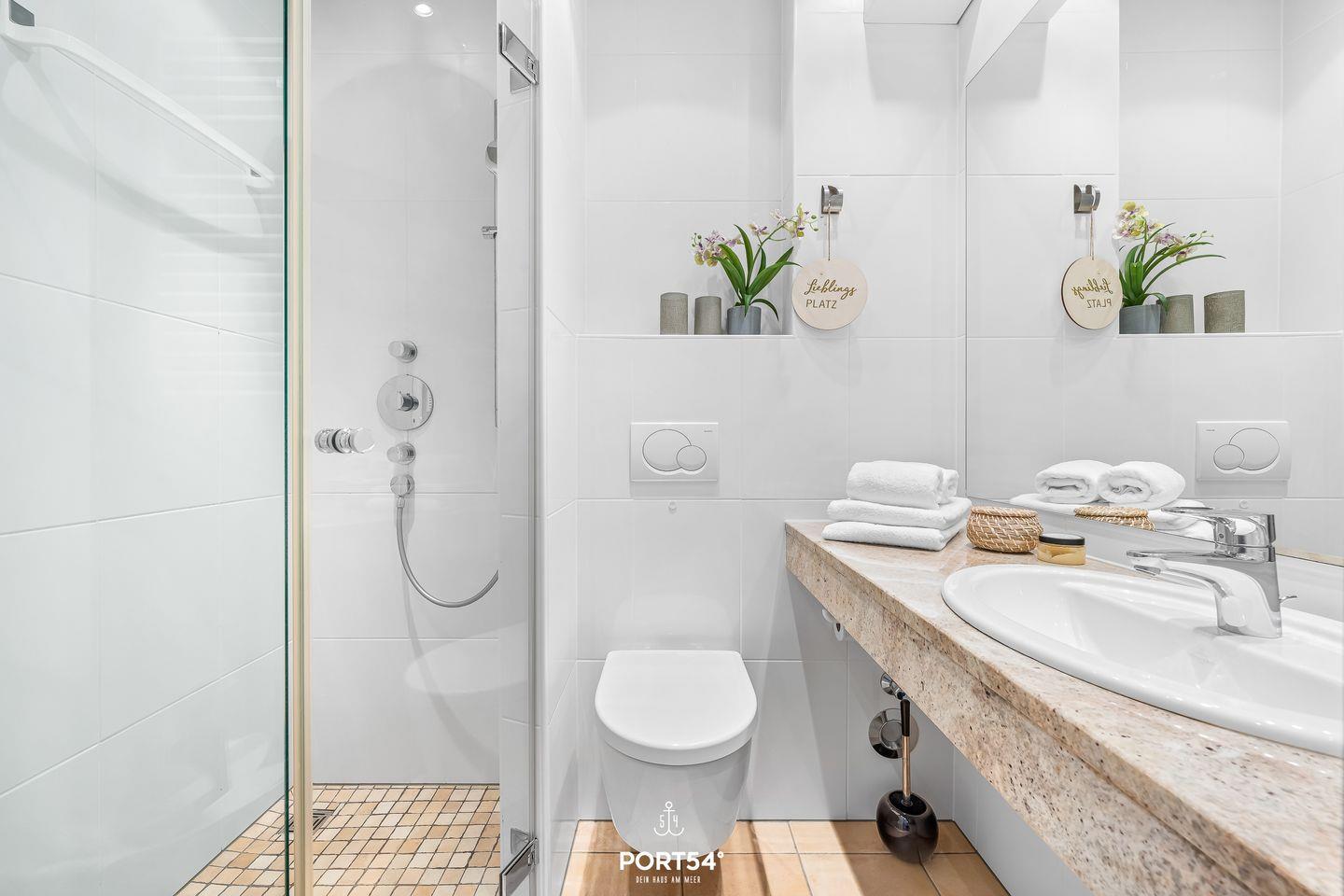 Das separate, hell geflieste Badezimmer ist modern ausgestattet und bietet mit einer Dusche mit Glasabtrennung, einem großen Waschtisch, Kosmetikspiegel, fest installiertem Föhn sowie warmem Wasser und praktischen Ablagemöglichkeiten einen komfortablen Start in den Tag. Für zusätzlichen Komfort stehen dir im Appartement auch Waschmaschine, Trockner, Staubsauger, Verdunkelungsmöglichkeiten, ein Kleiderschrank, WLAN sowie ein Feuermelder zur Verfügung.