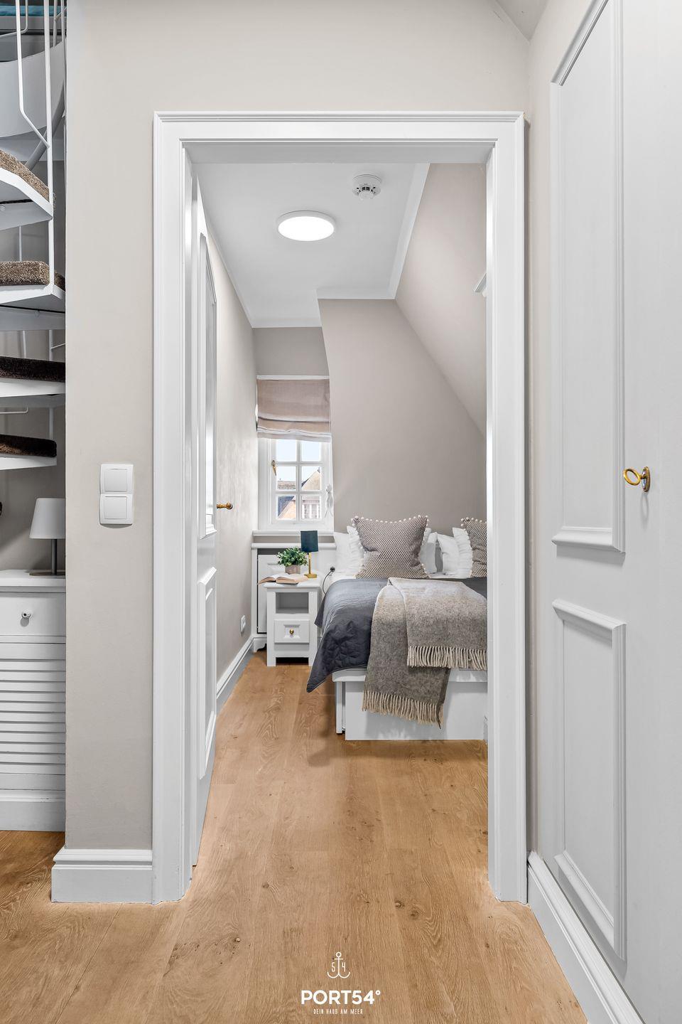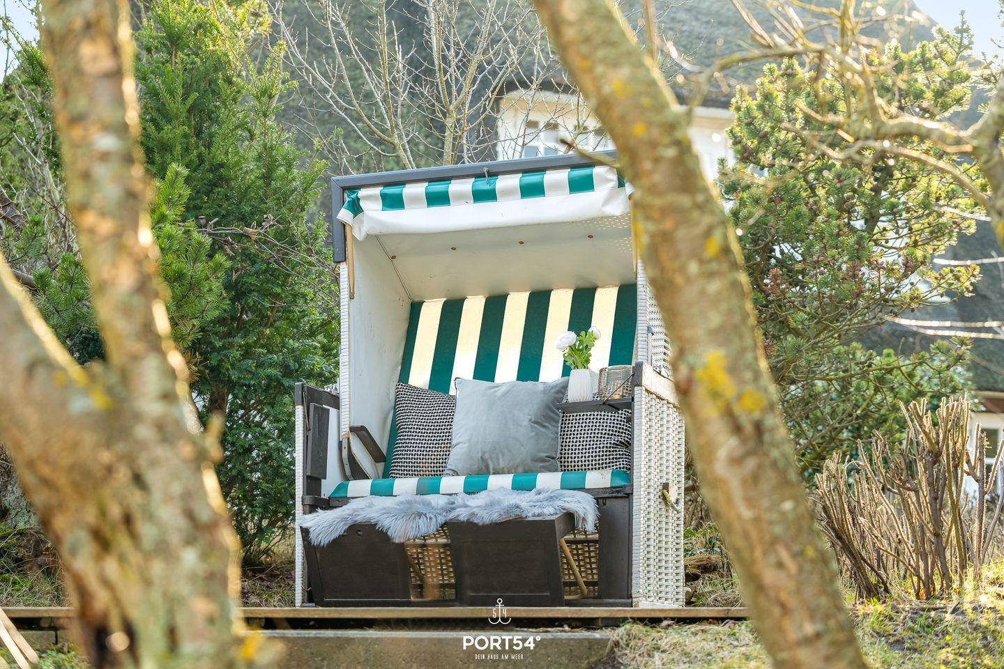 Das Schlafzimmer überzeugt mit einem kuscheligen Doppelbett (160 x 200 cm) und einem eingebauten Kleiderschrank, der viel Stauraum bietet und für Ordnung sorgt. Verdunkelungsmöglichkeiten sorgen dafür, dass du auch im hellen Nordseelicht angenehm schlafen kannst.
