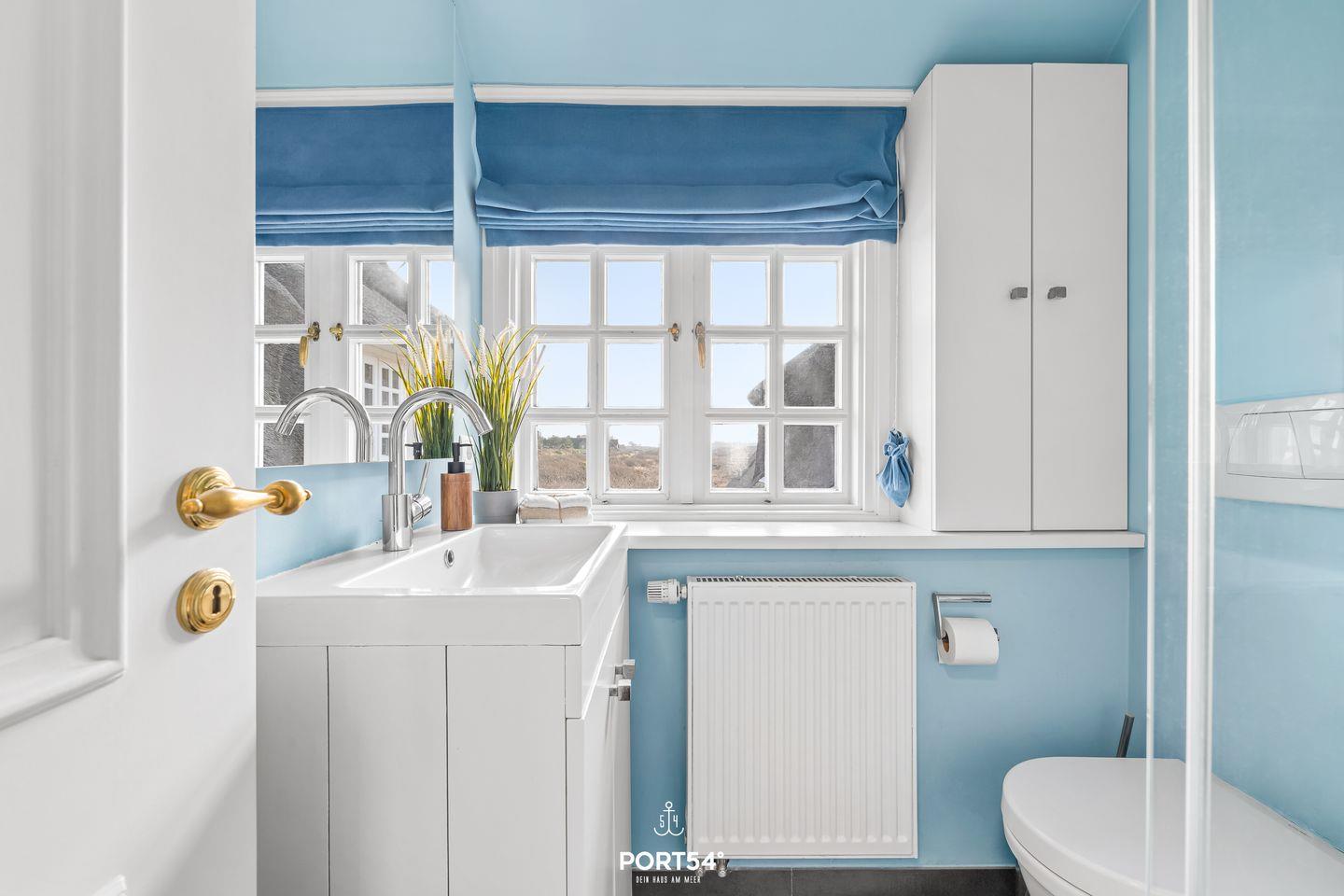 Das moderne Tageslicht-Duschbad ist über den Flur erreichbar und mit einer Dusche, einem großen Spiegel, Haartrockner, warmem Wasser und weiteren Ablagemöglichkeiten ausgestattet. Zusätzlicher Stauraum befindet sich im Flur sowie im Spitzboden in Form weiterer Einbauschränke – ideal für längere Aufenthalte.