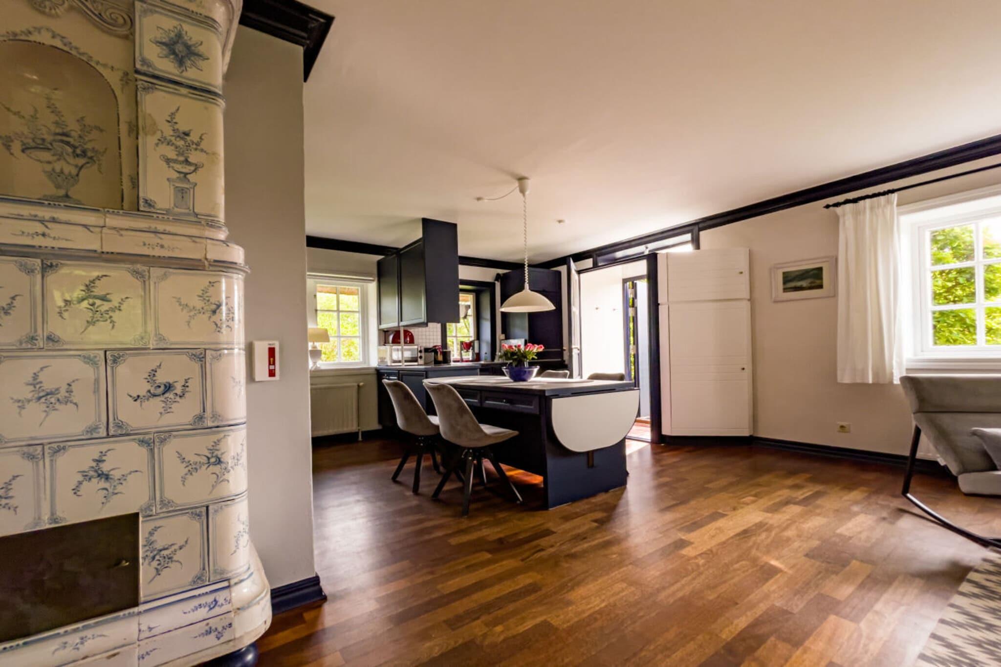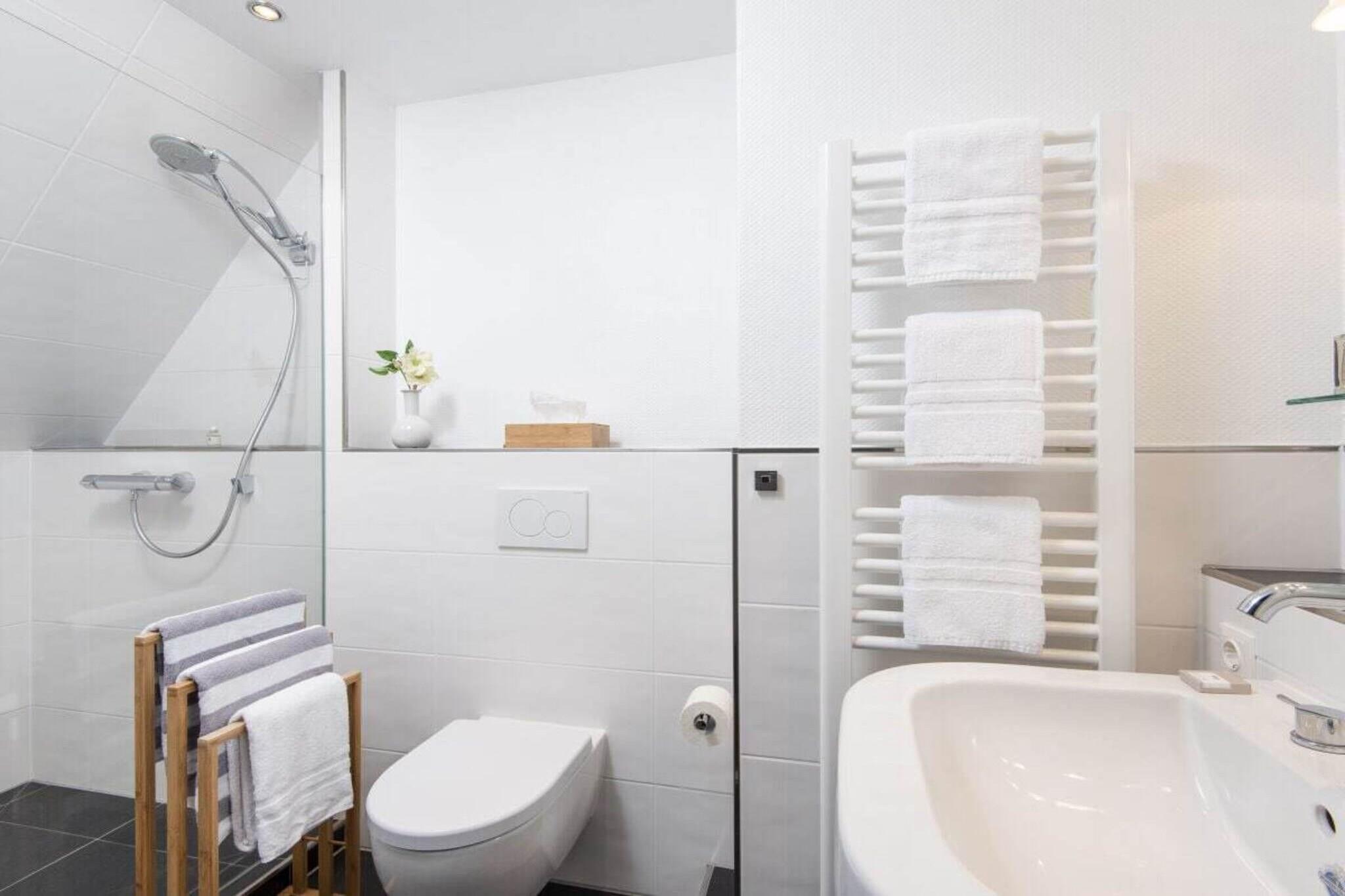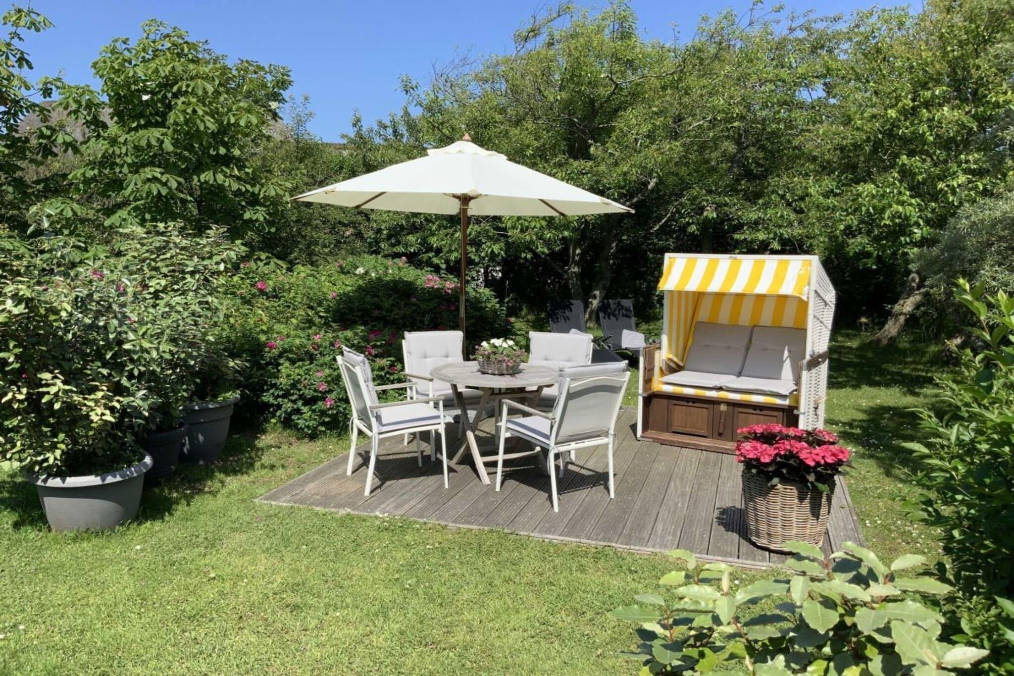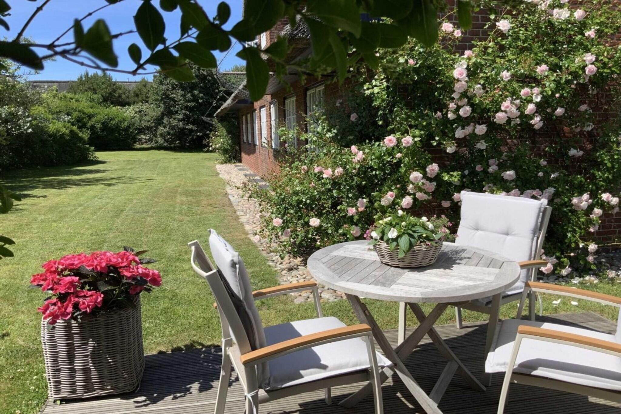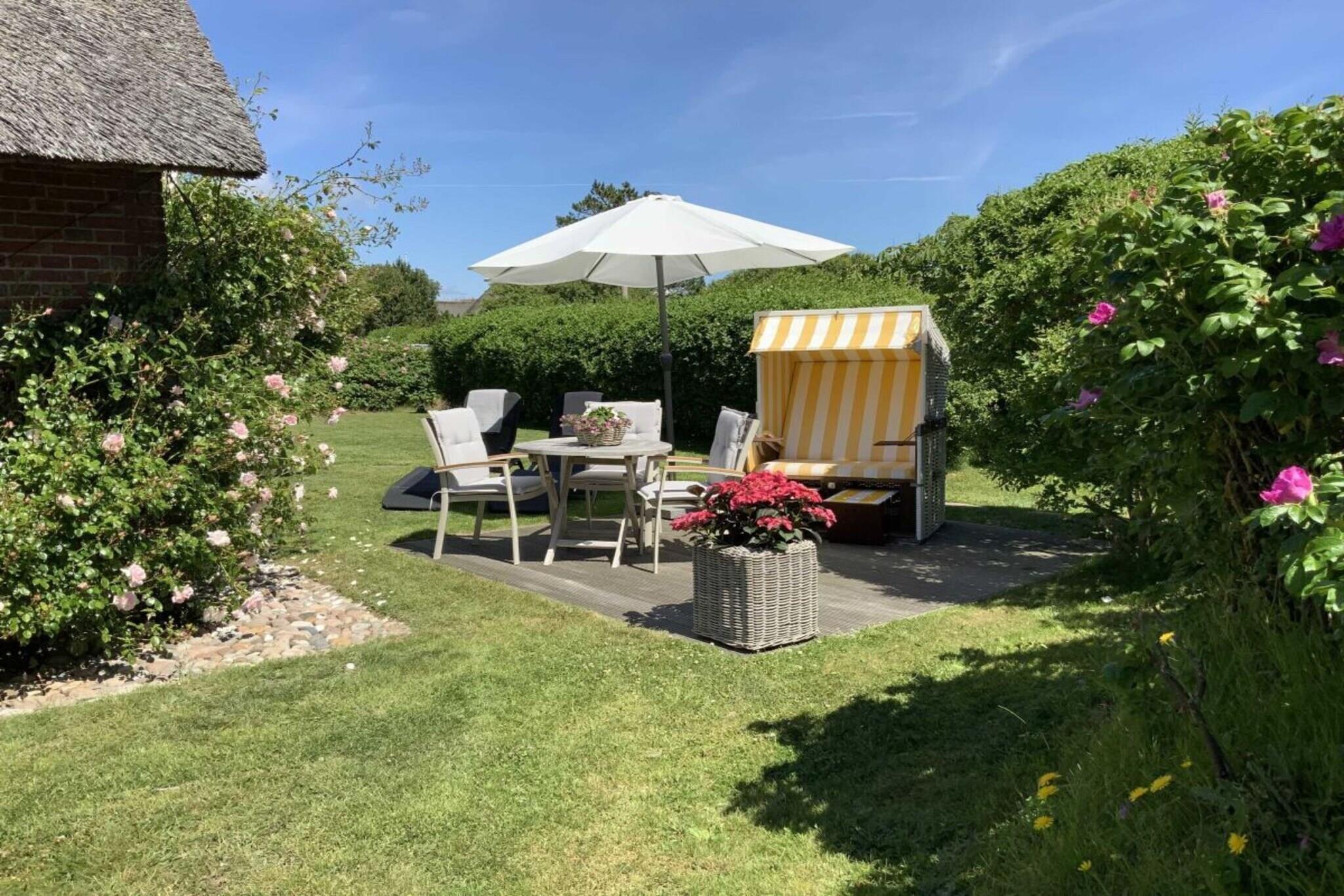 Vores feriehus ligger i hjertet af det gamle Kampen på en stor, solrig grund. Huset i frisisk stil med stråtag er opdelt i fire boligenheder. Mere information på vores hjemmeside: schroeders-haus-kampen.de Vores ferielejlighed 1A, sydøstvendt, ca. 80 m², er egnet til 2-3 personer. Stueetagen har en stor stue-spisestue (ca. 42 m²) med et integreret køkken, udstyret med alle moderne bekvemmeligheder (varmluftovn, emhætte, opvaskemaskine, mikrobølgeovn, Nespresso osv.). En komfortabel trætrappe fører op til øverste etage, hvor der er et soveværelse med dobbeltseng (smart-tv) og et soveværelse med to enkeltsenge, samt et moderne badeværelse med toilet og et opbevaringsrum. Stue- og spisestuen er udstyret med smart-tv, stereoanlæg, DVD- og Blu-ray-afspiller.