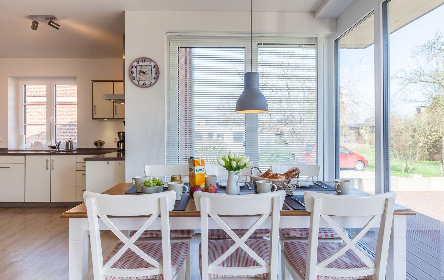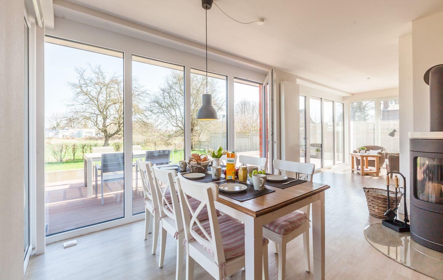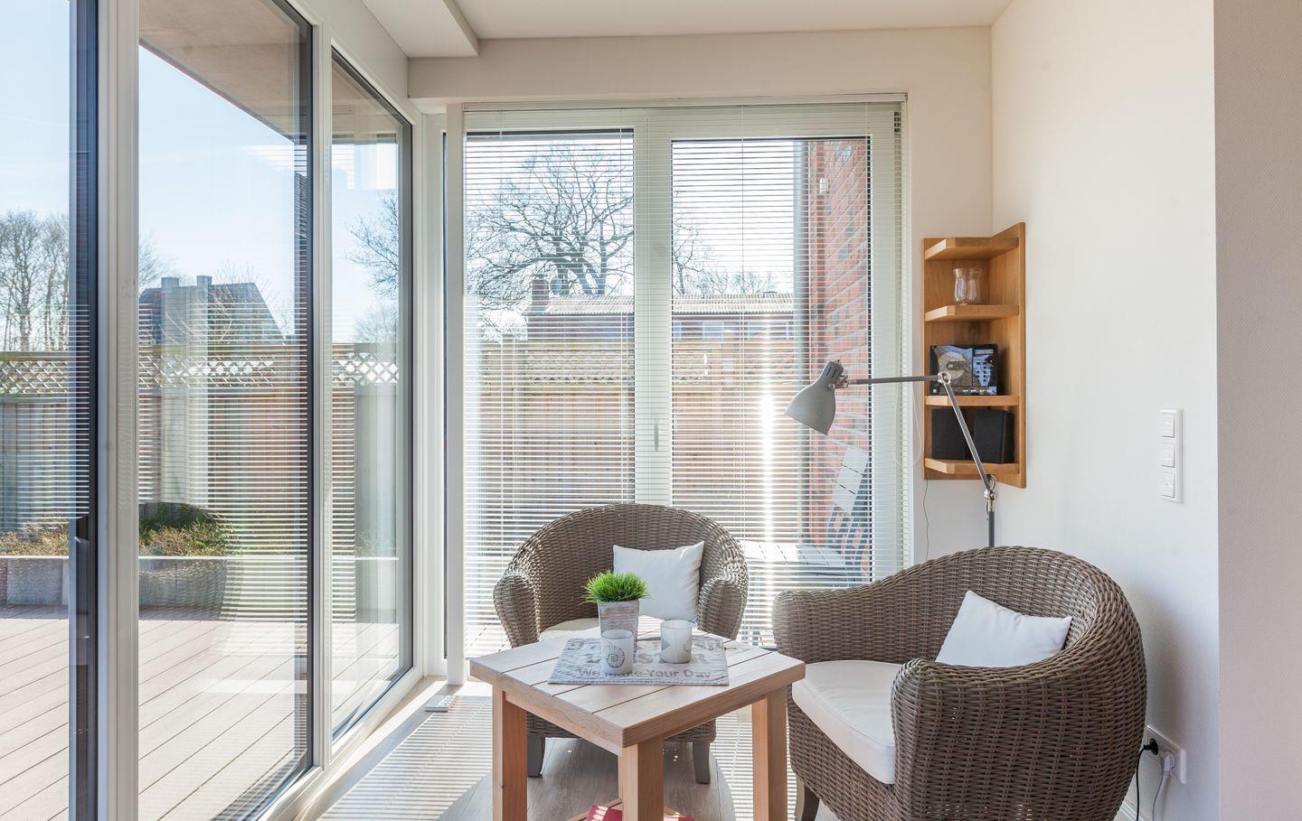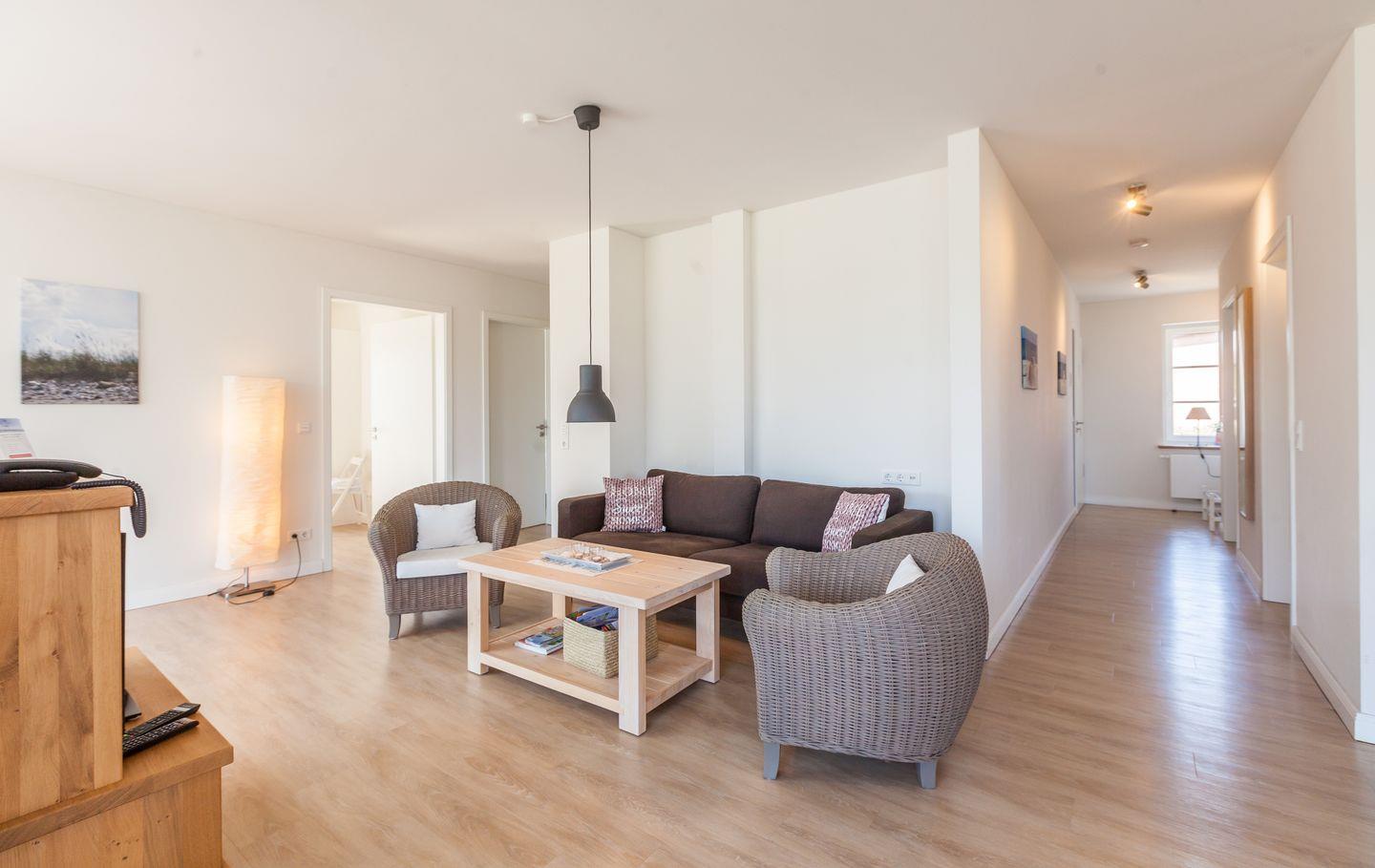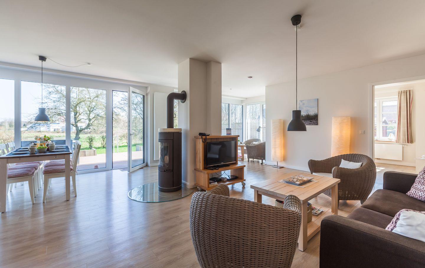 Die Ferienwohnung teilt sich auf in ein großes Wohnzimmer mit Terrasse inkl. Rollstuhlrampe, eine offene Küche mit diversen elektrischen Geräten und drei Doppelschlafzimmer (6x 80x200), eins davon rollstuhlgerecht.