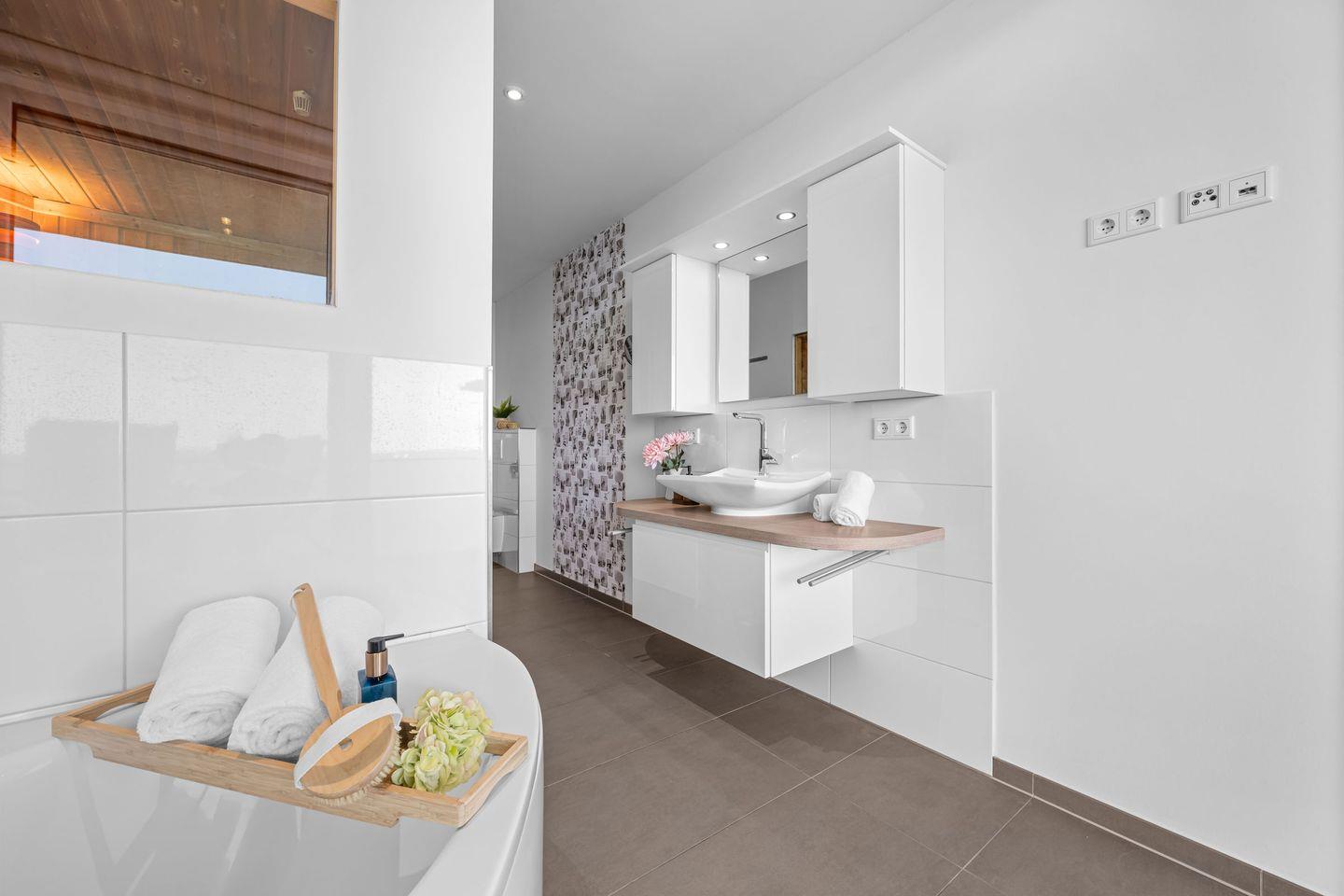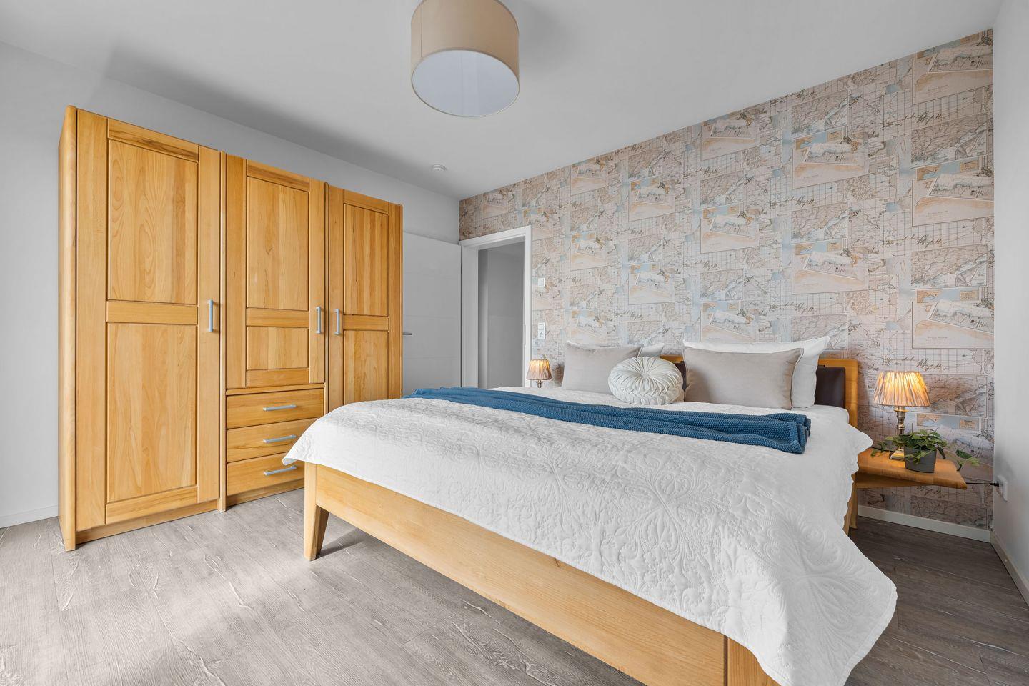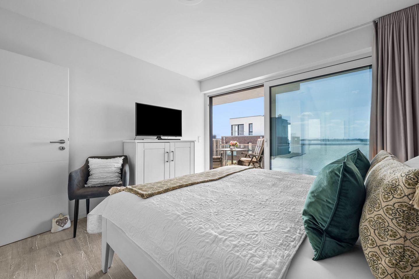 Drei Schlafzimmer stehen zur Verfügung. Zwei mit Doppelbetten und Zugang zum Sonnenbalkon Richtung Hafen, eins mit komfortabler Schlafcouch. Für Familien mit Kleinkind gibt es Hochstuhl und Kinderbett. Zwei Badezimmer sorgen für Komfort: eines mit Dusche, das andere mit Whirlwanne, bodengleicher Dusche und privater Sauna. Zusätzlich gibt es ein Gäste WC.