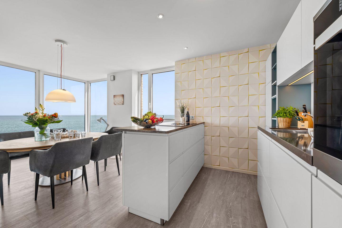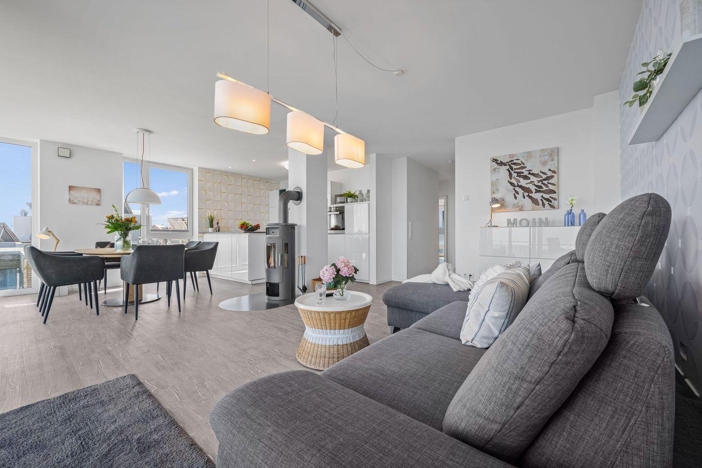 Die Ferienwohnung Küstenküche bietet auf 112 Quadratmetern Platz für bis zu sechs Personen. Der offene Wohnbereich mit Luxusküche, Esstisch, Kaminofen und Smart TV öffnet sich durch bodentiefe Fenster zur Ostsee. Die Küche in Insellösung ist komplett ausgestattet mit Induktionsherd, Mikrowelle, Espressokanne, Geschirrspüler und vielem mehr. Von hier aus gelangen Sie direkt auf den Balkon über den Wellen.