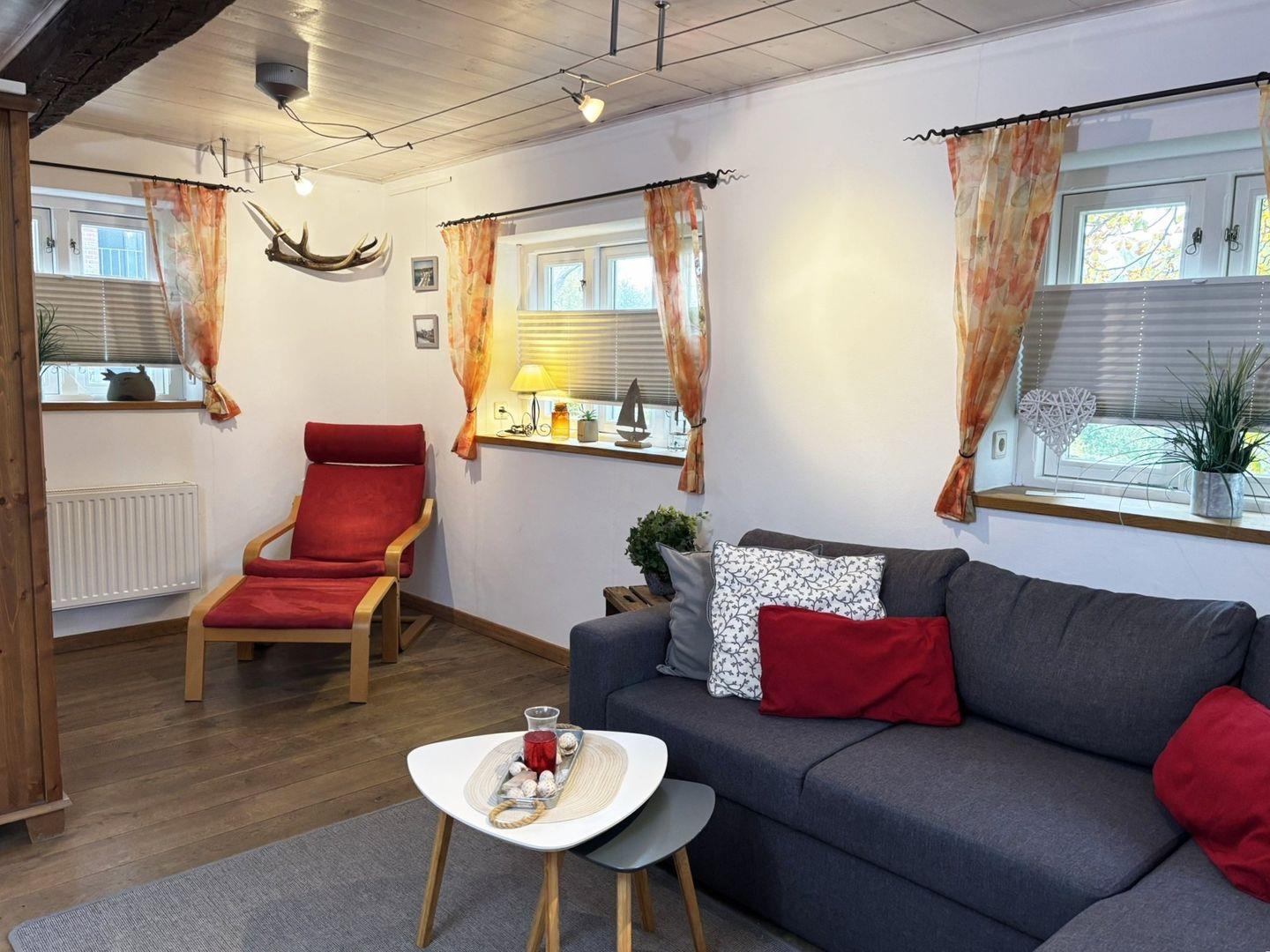 Im Inneren erwartet Sie eine voll ausgestattete Einbauküche mit Esstisch, die keine Wünsche offenlässt: Ein Cerankochfeld, Backofen, Kühlschrank mit Gefrierfach, Geschirrspülmaschine sowie Filterkaffeemaschine, Wasserkocher, Toaster und Handrührgerät stehen bereit, um Ihnen die Selbstverpflegung so angenehm wie möglich zu machen. Der angrenzende Wohnbereich mit Naturholzboden lädt zum Entspannen ein. Hier finden Sie ein bequemes Sofa mit Schlaffunktion (für 2 Personen), sowie einen Relaxsessel, ideal für gemütliche Leseabende. Zur Unterhaltung stehen SAT-TV, Radio und WLAN zur Verfügung.
