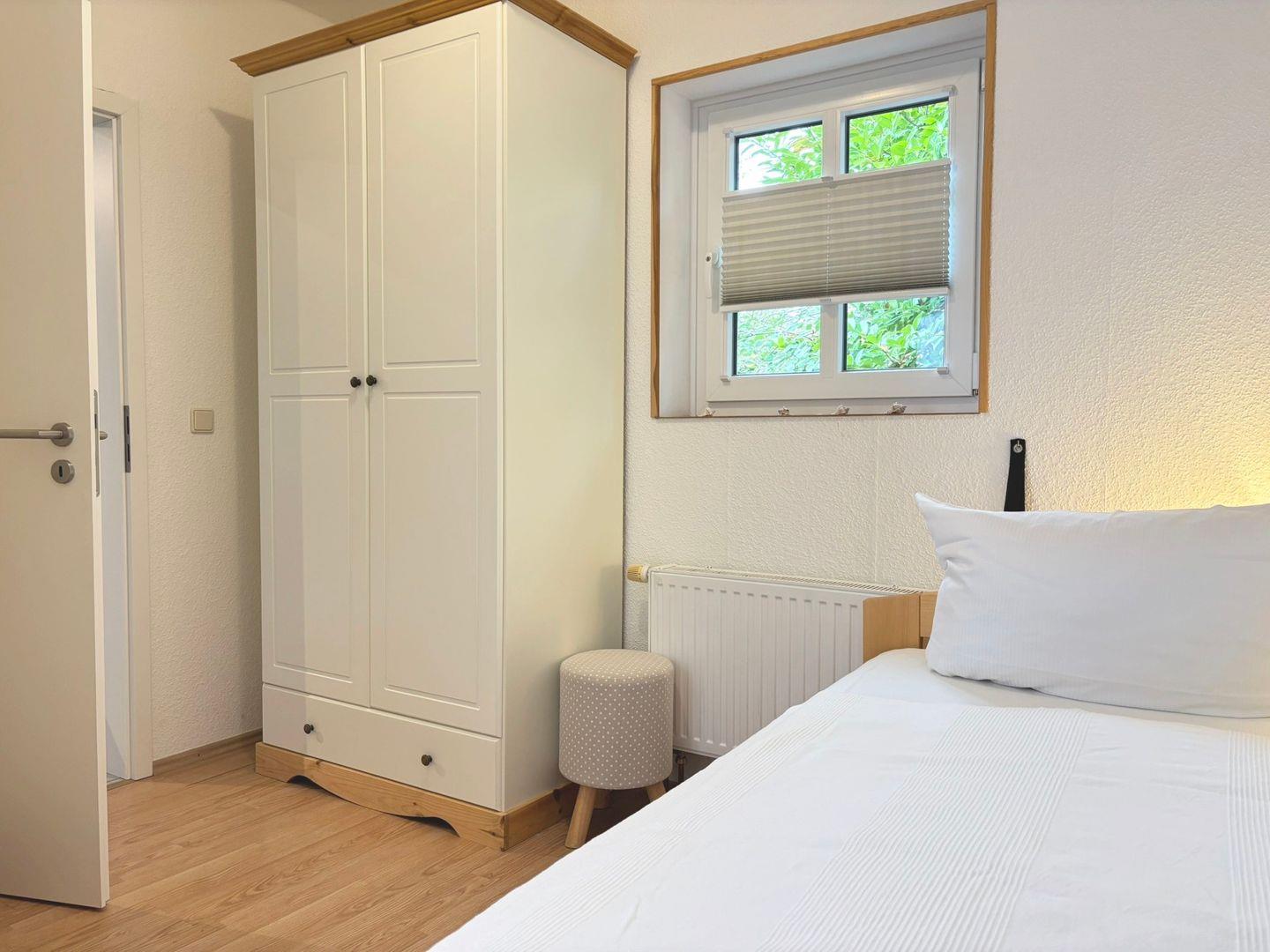 Das Ferienhaus verfügt über zwei Schlafzimmer. Im ersten Schlafzimmer schlafen Sie in einem Doppelbett mit getrennten Matratzen (180 x 200 cm, offenes Fußende), ein Kleiderschrank bietet ausreichend Stauraum, und dank der Verdunklungsmöglichkeiten lässt es sich hier wunderbar ausschlafen. Das zweite Schlafzimmer ist mit zwei Einzelbetten (je 90 x 200 cm) ausgestattet und ebenfalls mit einem Kleiderschrank und Verdunklung versehen. Das zusätzliche Schlafsofa im Wohnzimmer sorgt für Flexibilität und Komfort für bis zu sechs Personen.