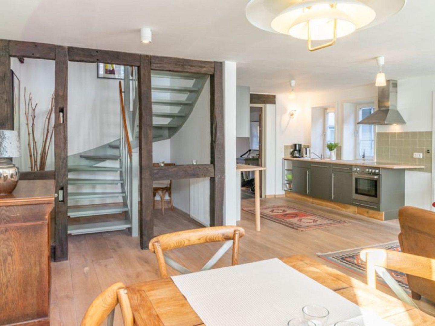 Ein besonderes Highlight ist der Treppenaufgang, der von altem Fachwerk eingerahmt wird und dem Haus eine einzigartige, hyggelige Note verleiht. Im Erdgeschoss befindet sich ein praktisches Gäste-WC sowie eine Abstellkammer mit Waschmaschine und Trockner – alles stilvoll und durchdacht platziert.