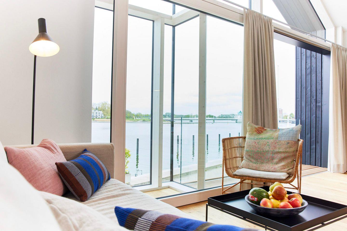 Das Herzstück Ihrer Unterkunft ist der großzügige Wohn- und Essbereich, der durch eine riesige Panorama-Glasfront eine direkte Verbindung zum Wasser schafft. Ein besonderes Highlight: Wenn Sie das große Fensterelement weit öffnen, holen Sie sich die frische Brise und die Hafenatmosphäre direkt ins Wohnzimmer. Ob beim Frühstück oder mit einem Glas Wein am Abend – von diesem Logenplatz aus erleben Sie die Schlei hautnah. Die Kombination aus hochwertigen Echtholzböden und klarem Design sorgt für ein gemütliches Ambiente.