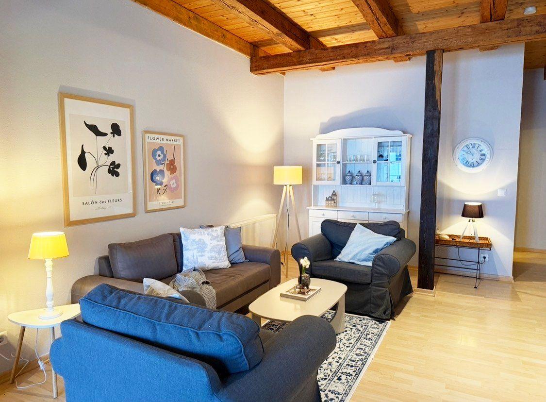Die Ferienwohnung „Heuboden“ auf dem Nübbelhof bietet auf großzügigen 110 m² eine gelungene Kombination aus romantischem Landhausstil und komfortabler Ausstattung. Die über zwei Etagen angelegte Unterkunft ist ideal für bis zu vier Personen konzipiert und besticht durch ein gemütliches Ambiente, das durch eine Fußbodenheizung (Badezimmer und Küche) zu jeder Jahreszeit behaglich ist. Das Herzstück der Wohnung bildet das offene Wohnzimmer mit einladender Sofaecke, an das sich der Essbereich und die voll ausgestattete Küche direkt anschließen. Mit Ceranherd, Backofen, Spülmaschine und praktischen Küchenhelfern wie Mixer ist hier die Selbstversorgungsmöglichkeit garantiert. Die Schlafmöglichkeiten verteilen sich auf zwei separate Schlafzimmer, während ein Badezimmer mit Dusche sowie ein zusätzliches Gäste-WC für ausreichend Komfort sorgen. Ein Schlafzimmer verfügt über ein Doppelbett (180x200cm) mit getrennten Matratzen und das andere Schlafzimmer über zwei Einzelbetten.