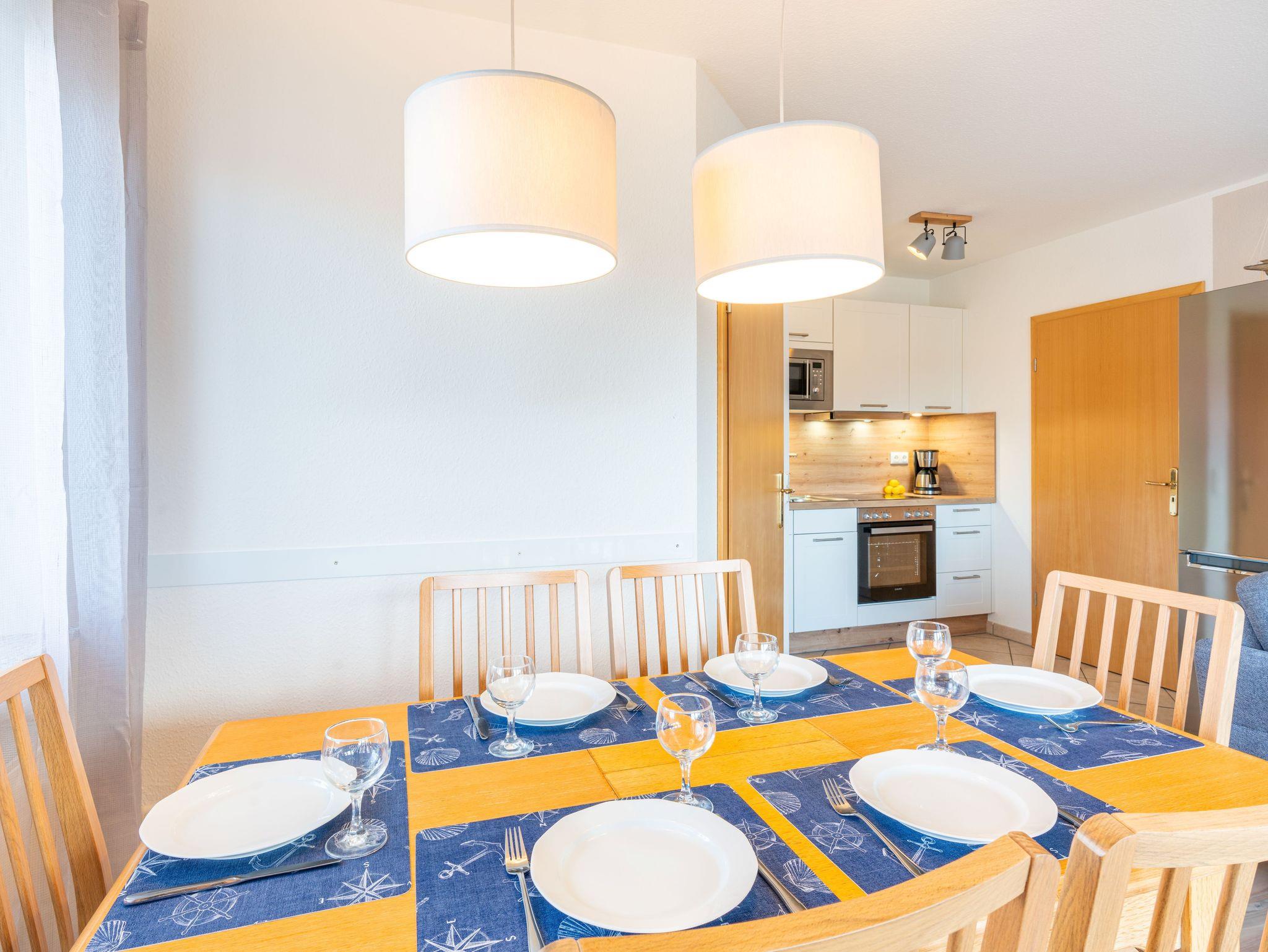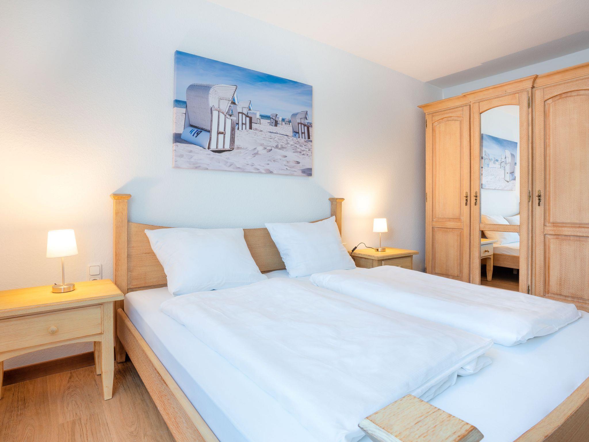 Es erwartet Sie ein Wohnzimmer mit einer gemütlichen Sitzecke, Sat-TV und einer offenen, komplett eingerichteten Küchenzeile mit Geschirrspüler. Die zwei Bäder sind mit Dusche und WC ausgestattet. Zwei komfortable Schlafzimmer sind mit jeweils einem Doppelbett ausgestattet und eins mit zwei Einzelbetten. Auf einem Balkon können sie den Tag gemütlich ein- und ausklingen lassen. WLAN ist vorhanden. Waschmaschine und Trockner können Sie gegen Entgelt verwenden. Natürlich wird Ihnen ein PKW-Parkplatz auf dem Grundstück zur Verfügung gestellte. Der feinsandige, weiße Badestrand ist in nur ca. 3-4 Gehminuten.