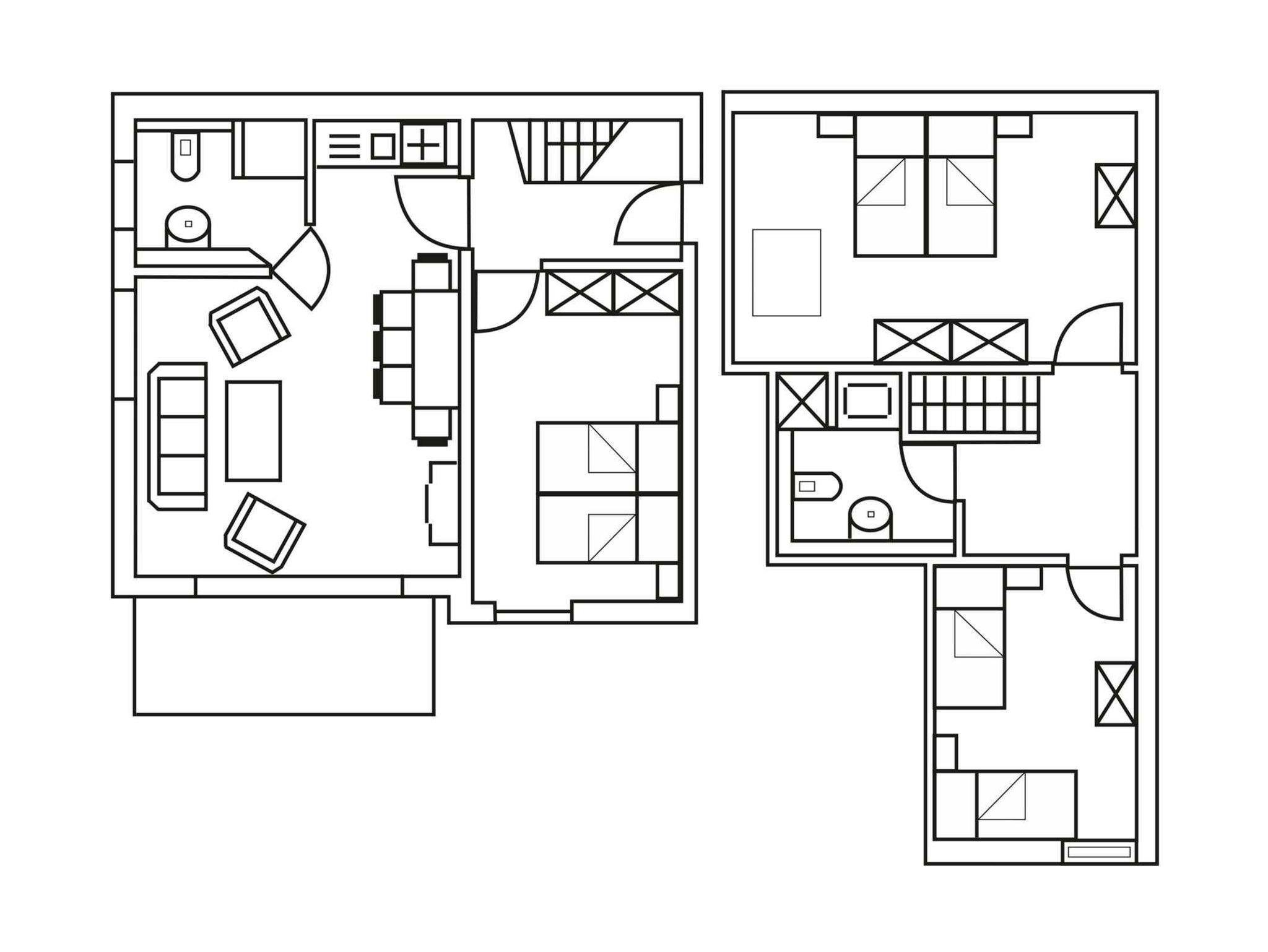 Die Ferienwohnungen mit dem Typ 3-2 mit Haustier sind für bis zu 8 Personen ausgelegt (6 Pers. + 2 Aufbettungen). Sie besitzen eine Wohnfläche 96 m² und erstrecken sich über zwei Etagen. In der unteren Etage befinden sich der Wohnbereich mit offener Küche und ein Badezimmer. Auf der oberen Etage finden drei Schlafzimmer und ein weiteres Badezimmer ihren Platz.
