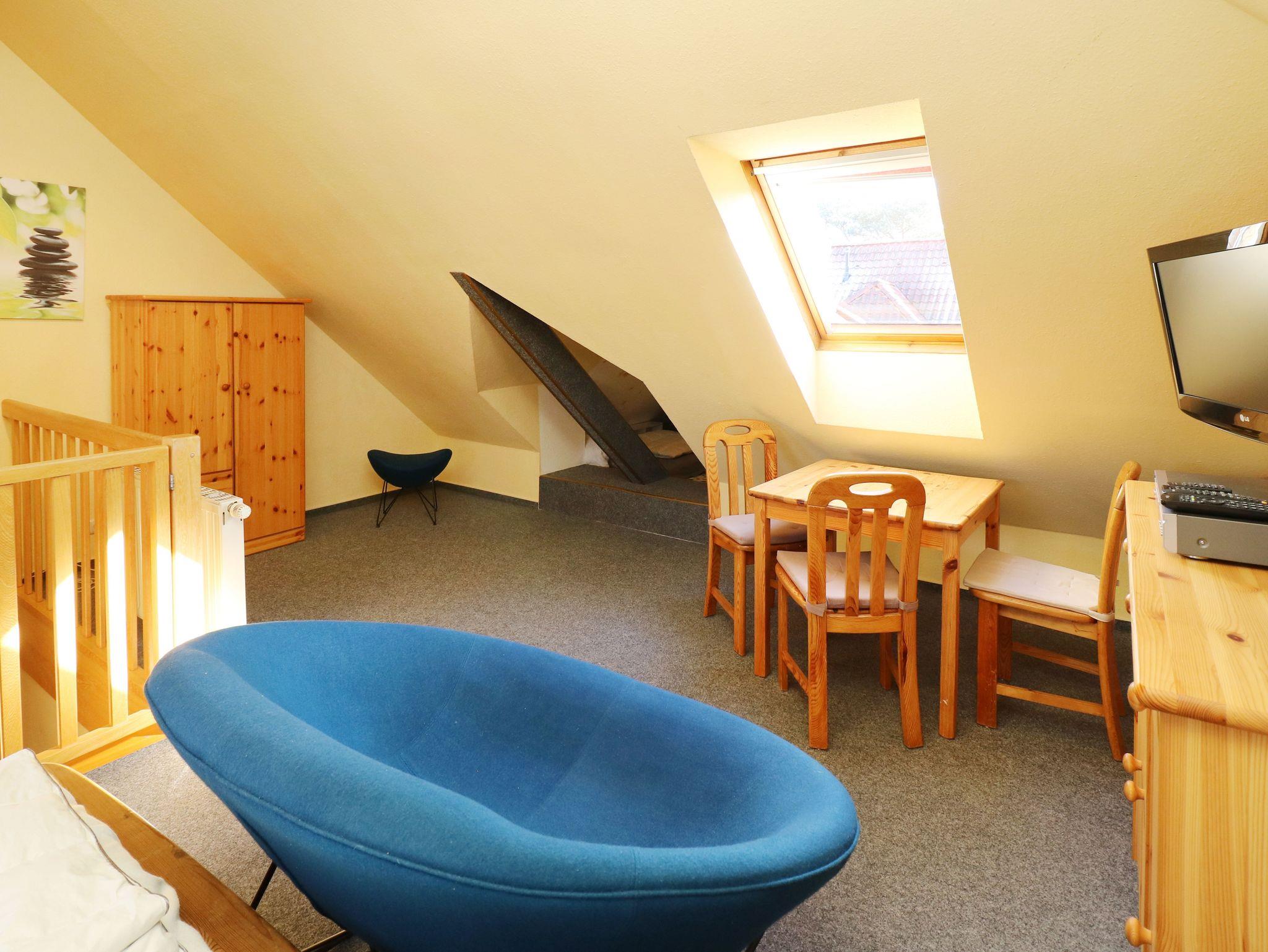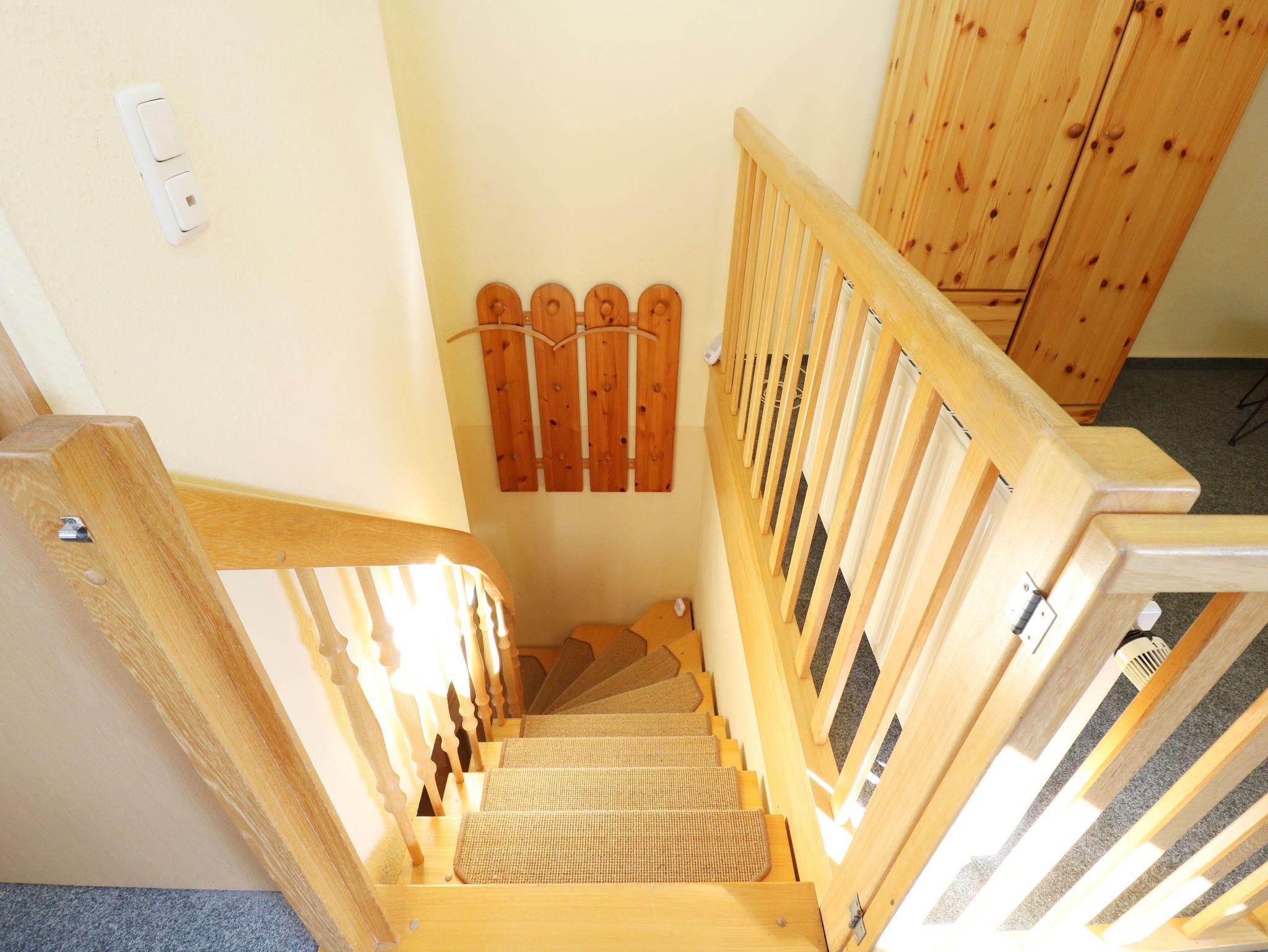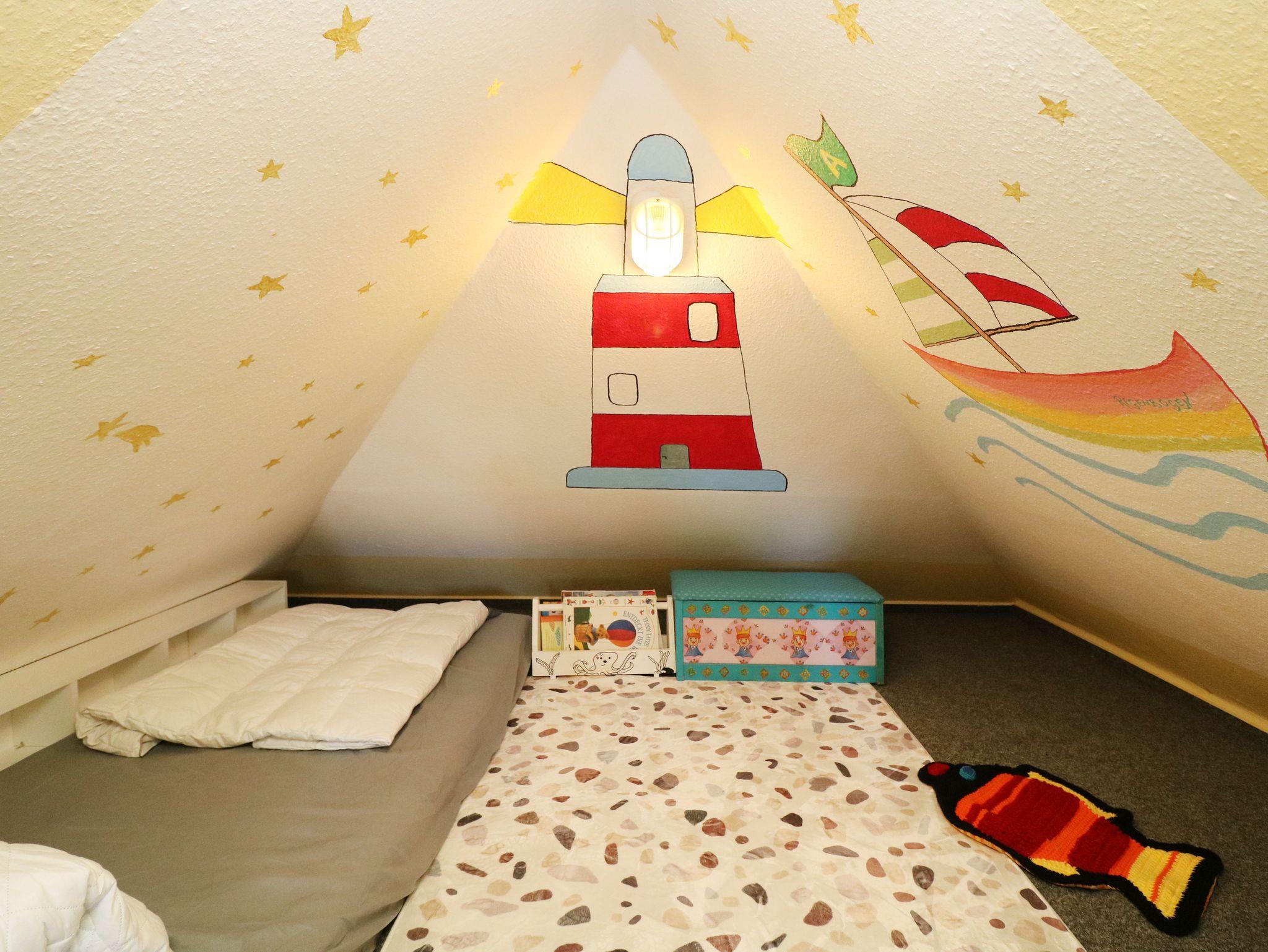 Ein Schlafzimmer mit Doppelbett 2 x 90 x 200 cm befindet sich unteren Geschoss. Das zweite Schlafzimmer befindet sich im Dachgeschoss und ist zur Treppe hin offen. Der Schlafraum ist ausgestattet mit einem Doppelbett 2 x 90 x 200 cm. Im oberen Schlafzimmern ist Platz für mindestens 1 Baby, das noch im Babybett schläft.