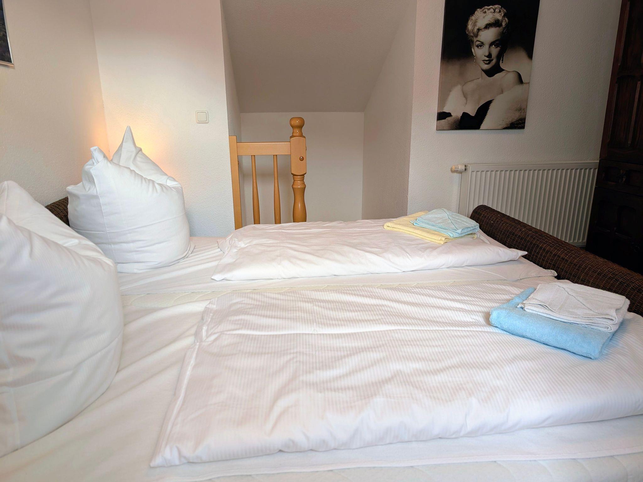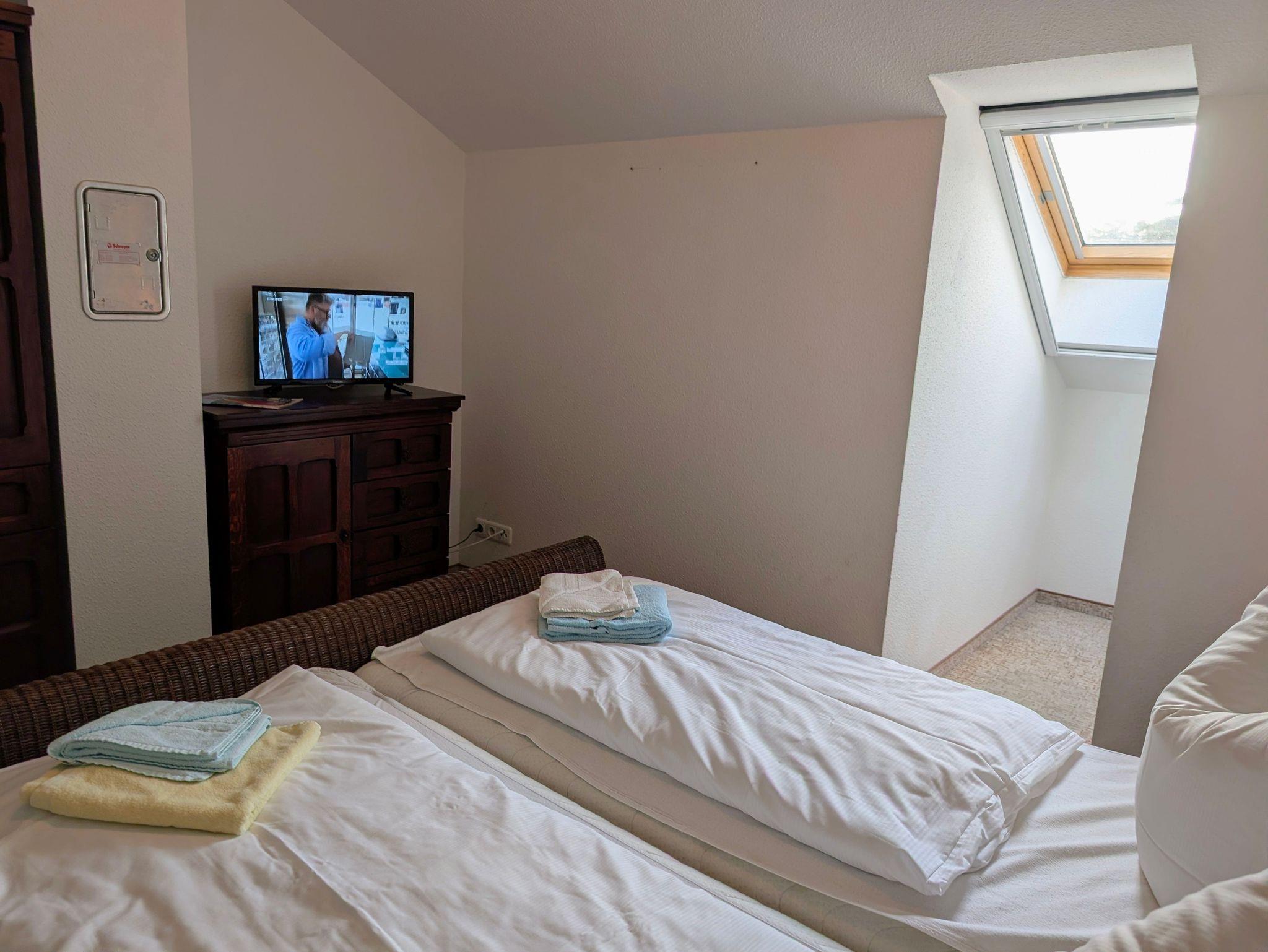 Das Schlafzimmer verfügt über ein komfortables Doppelbett (2 × 90/200 cm), zwei Einzelbetten (2 × 90/200 cm) sowie einen geräumigen Kleiderschrank. Eine weitere Schlafmöglichkeit bietet der offene Spitzboden, in dem sich ein weiteres Doppelbett (2 × 90/200 cm) und ein zusätzlicher TV befinden ideal für Familien oder befreundete Paare.