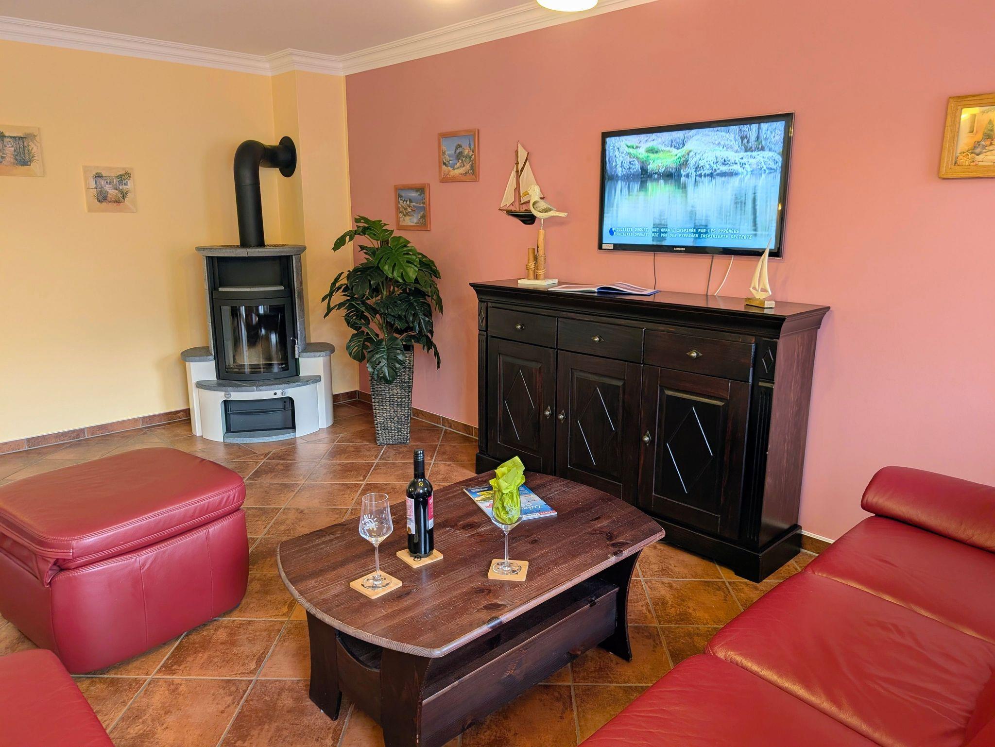 Die großzügige Drei-Raum-Ferienwohnung Waldblick mit etwa 75 m² befindet sich im 1. Obergeschoss des Ferienhauses und bietet viel Platz für einen erholsamen Urlaub. Sie verfügt über eine gut ausgestattete Kochnische, ein modernes Duschbad, einen Balkon, SAT-TV und viele weitere Annehmlichkeiten. Im Wohnbereich laden ein gemütliches Sofa, ein TV-Schrank mit HiFi-Anlage sowie ein Esstisch mit sechs bequemen Stühlen zum Verweilen ein. Besonders in der kühleren Jahreszeit sorgt der Kamin im Wohnzimmer für wohlige Wärme und gemütliche Abende in entspannter Atmosphäre. Durch die große Fensterfront nach Westen gelangen Sie auf den geräumigen Balkon mit Sitzmöbeln für vier Personen der ideale Ort, um den Tag entspannt ausklingen zu lassen.