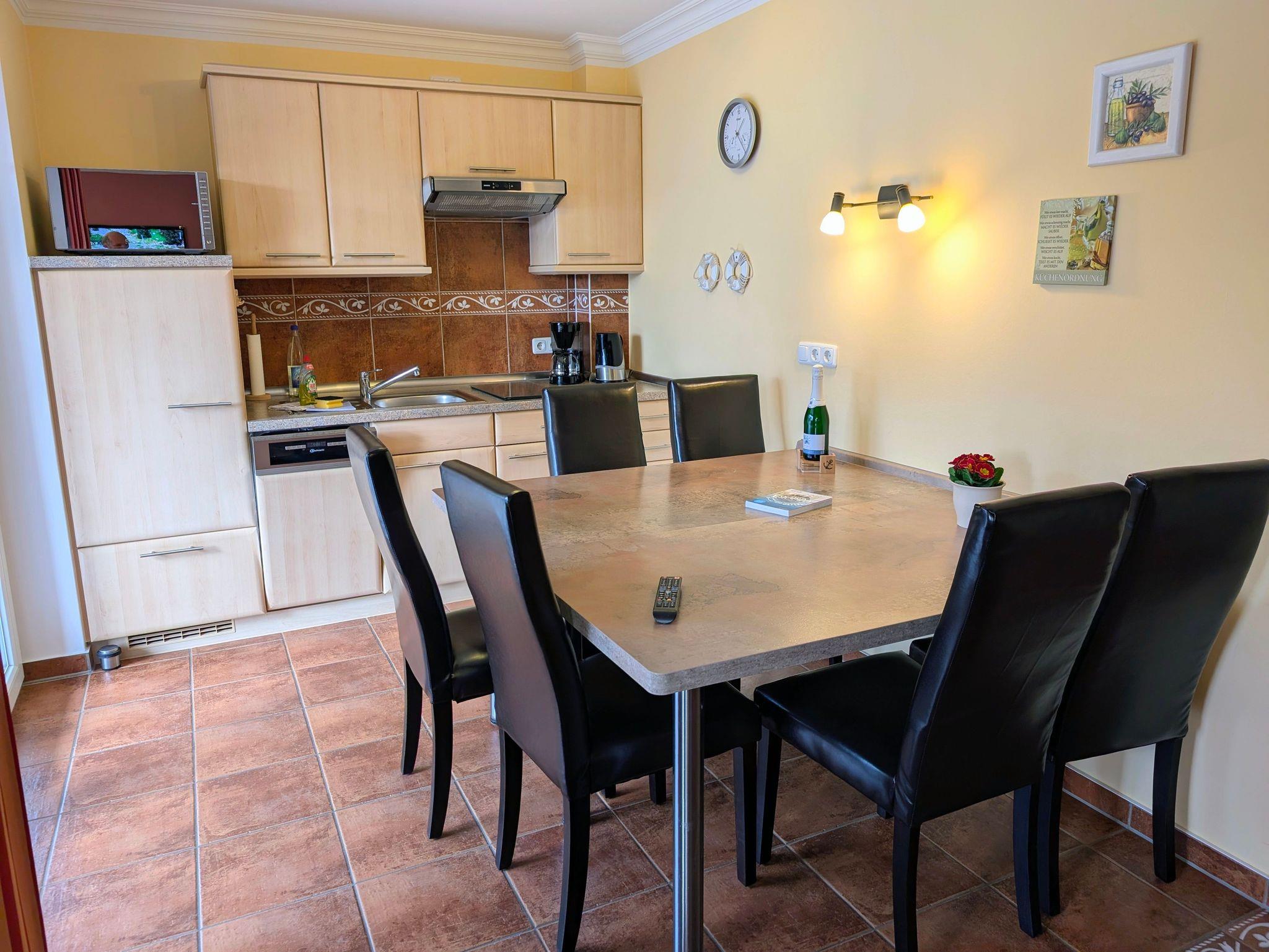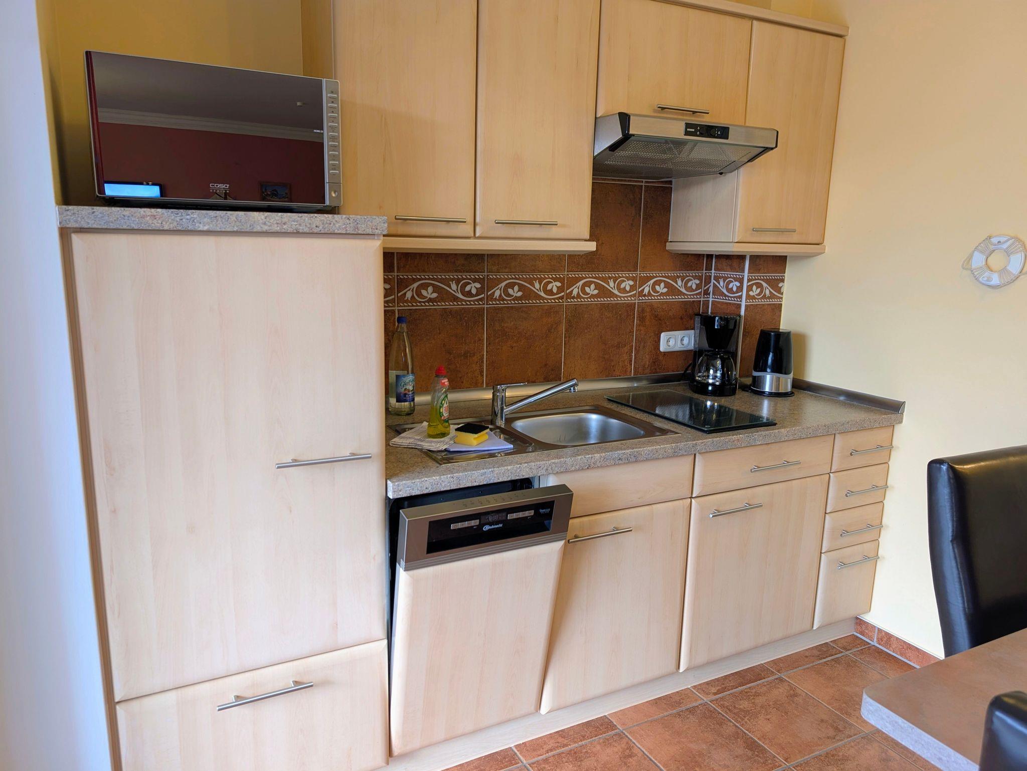 - Küche mit Geschirrspüler, 2-Platten-Herd, Microwelle, Kaffeemaschine, Wasserkocher, Geschirr & Besteck u.v.m.