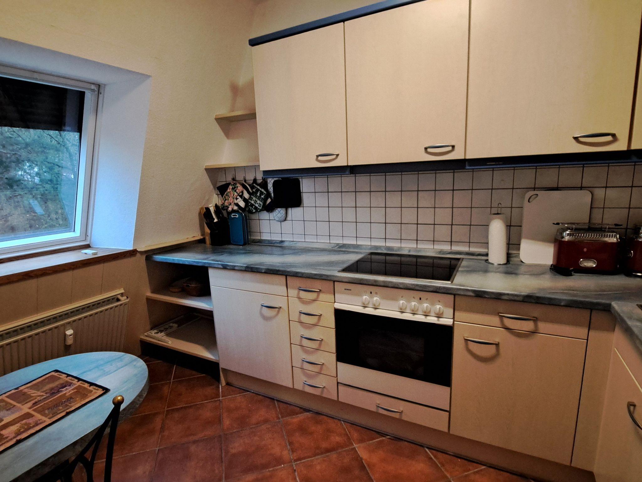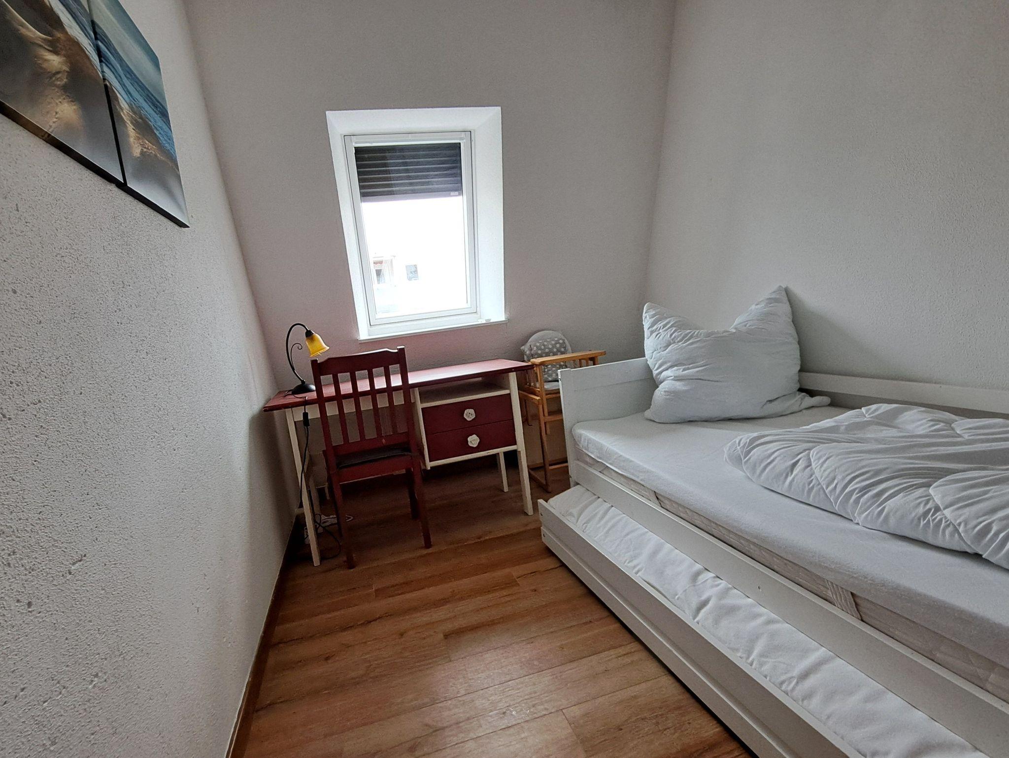 Die Ferienwohnung verfügt über ein Schlafzimmer mit einem Boxspringbett (180 x 200 cm) und ein Schlafzimmer mit einem Funktionsbett (90 x 200 cm). Durch das platzsparende Bett bietet dieses Zimmer, das als Kinderzimmer geeignet ist, viel Raum zum Spielen. Für kleine Gäste sind Bücher, Spielzeug und ein Hochstuhl vorhanden. Außerdem stehen Ihnen ein gemütliches Wohnzimmer, eine separate Küche sowie ein Bad mit Badewanne, Duschmöglichkeit und WC zur Verfügung. Im Keller befindet sich auch ein nicht abschließbarer Raum zum Abstellen von Fahrrädern.