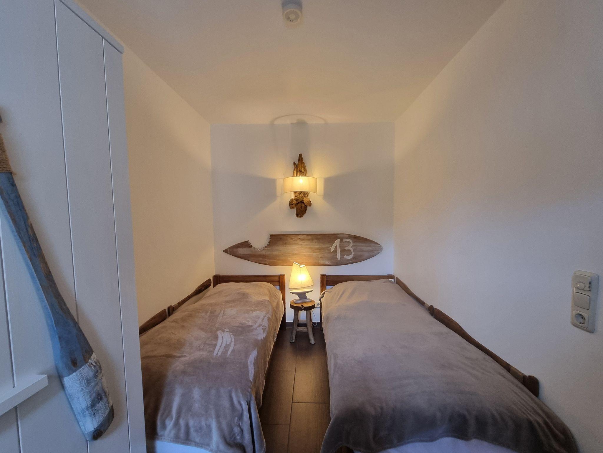 Die 2 Schlafzimmer bieten maximale Flexibilität: Ein großes Zimmer mit einem 180 cm breiten Doppelbett sowie ein zweites Zimmer mit zusammenstellbaren Einzelbetten. Das stilvolle Wohlfühlbad mit Dusche rundet das Angebot ab. Alle Fenster sind mit Insektenschutzgittern ausgestattet, damit Sie die frische Brise ungestört genießen können. Auf dem Südbalkon genießen Sie die Sonne mit einem unverbauten Blick in die Natur.