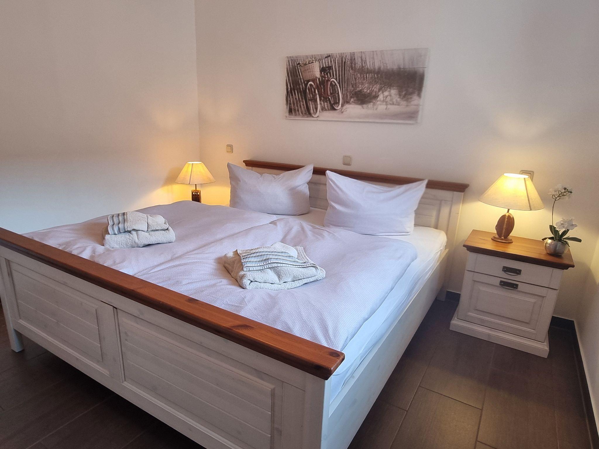 Weitere Highlights der Ausstattung bildet ein großes Hauptschlafzimmer mit einem komfortablen 180 cm breiten Doppelbett. Es steht ein zweites Schlafzimmer mit zwei Einzelbetten zur Verfügung, die flexibel als getrennte Betten oder zusammenstehend genutzt werden können. Ein modernes Wohlfühlbad mit geräumiger Dusche sorgt für entspannte Momente. Alle Räume verfügen über pflegeleichte und hochwertige Fliesenböden mit Fussbodenheizung.