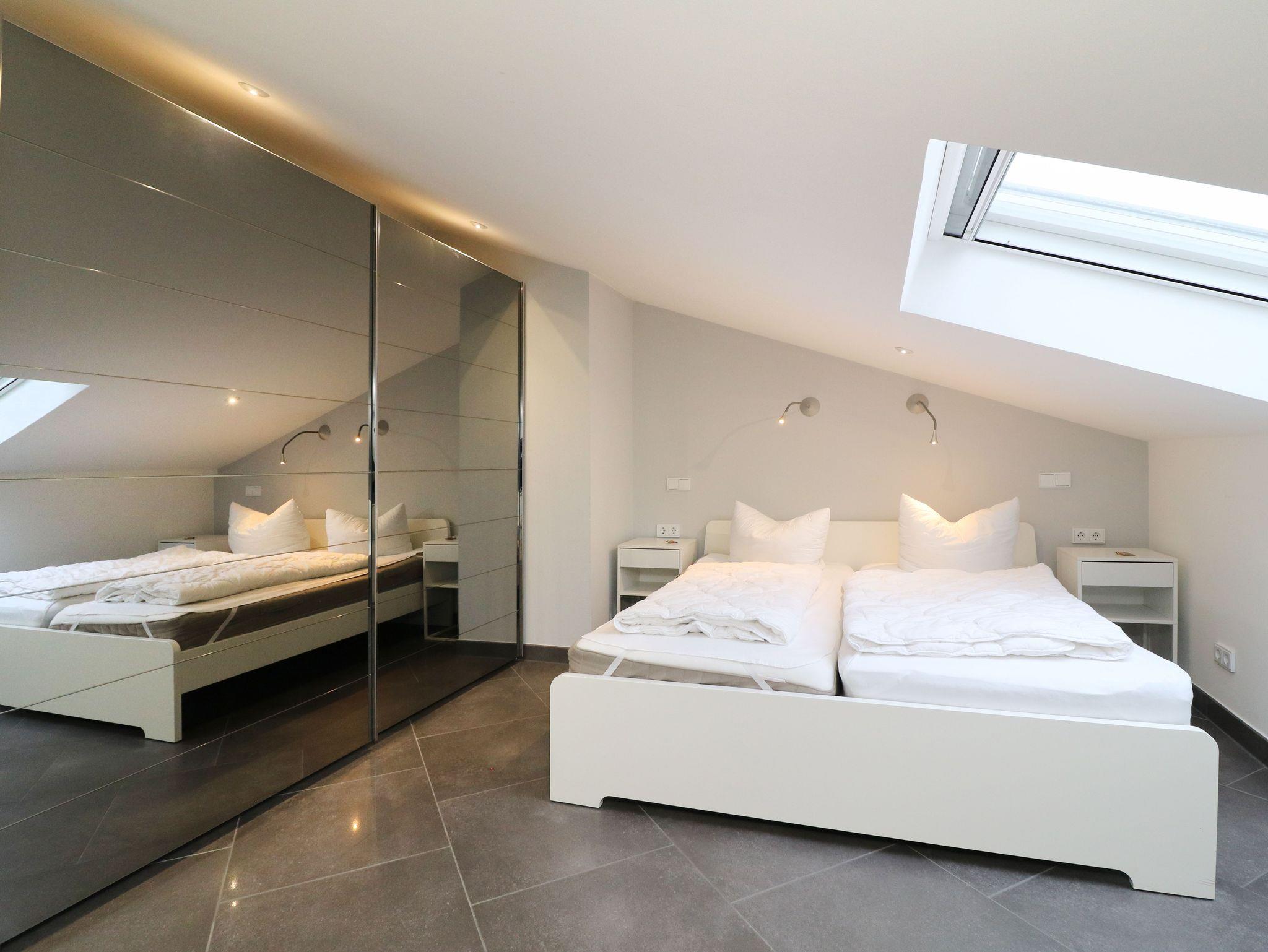 Die Ferienwohnung S03 bietet ein gemütliches Schlafzimmer, ein einladendes Wohnzimmer mit integrierter Essecke sowie eine vollständig ausgestattete Einbauküche. Das moderne Badezimmer verfügt über eine ebenerdige Dusche und eine Badewanne. Die Wohnung hat aufgrund der Lage Dachschrägen und keinen Balkon oder Terrasse.