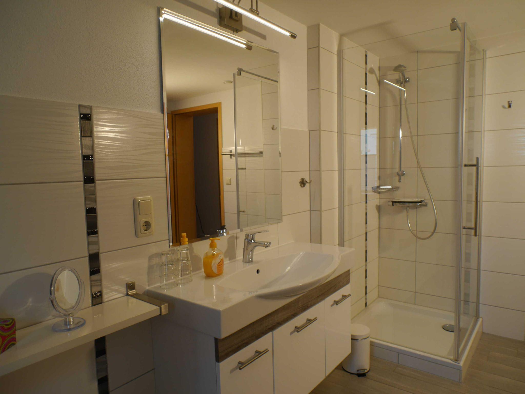 Die Ferienwohnung verfügt über Sat-TV und Radio und hat eine Wohnküche mit Herd, Geschirrspüler, Kühlschrank, Toaster, Mikrowelle, Kaffeemaschine und Essecke sowie ein Bad mit WC, Waschtisch und Dusche. Die Ferienwohnung ist modern eingerichtet und verfügt über eine überdachte Terrasse mit Gartenmöbeln und Grill. - Kinderzimmer mit 3 Betten - Schlafzimmer mit Doppelbett, Aufbettung auch Kinderbett) ist möglich