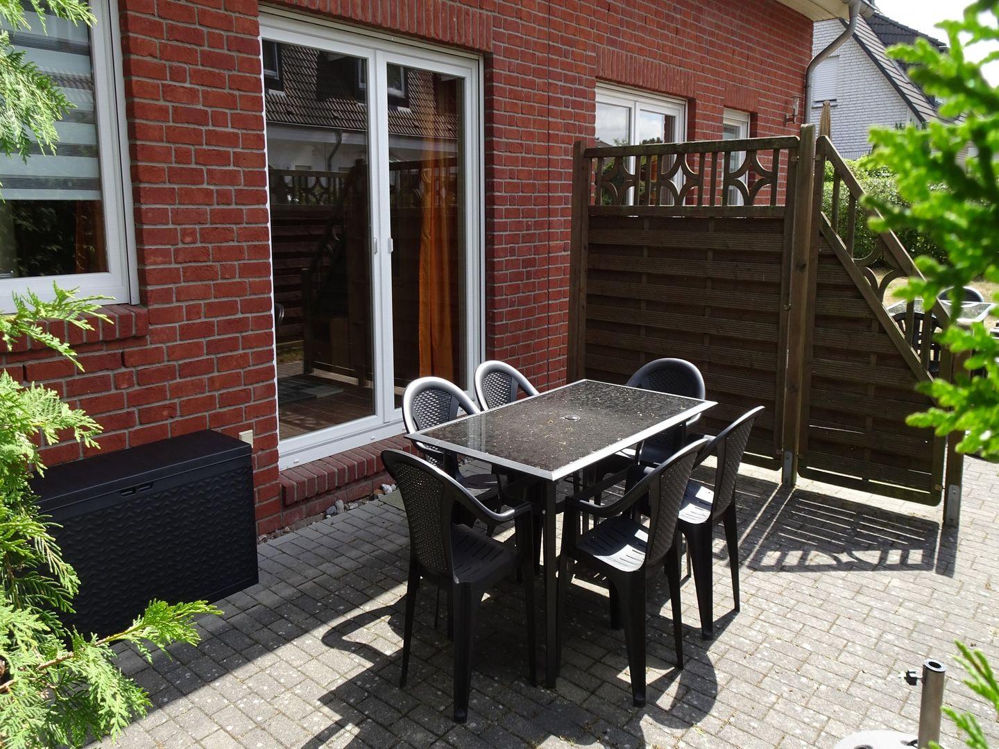 Die Terrasse ist ein weiterer Pluspunkt des Hauses. Sie ist durch einen Sichtschutz abgegrenzt und mit Terrassenmöbeln für bis zu sechs Personen sowie einem Sonnenschirm ausgestattet.