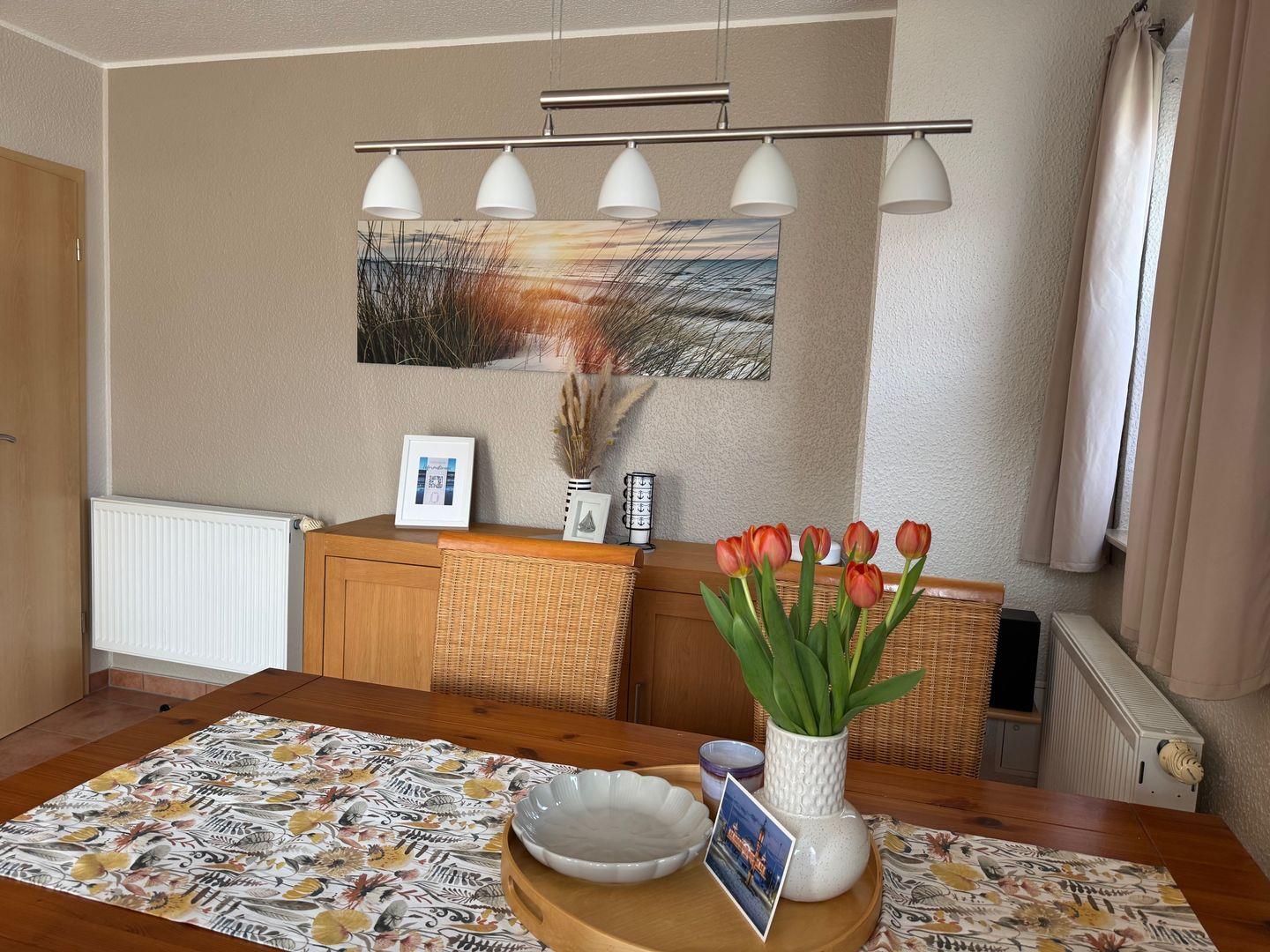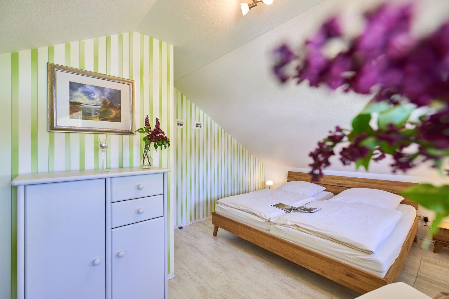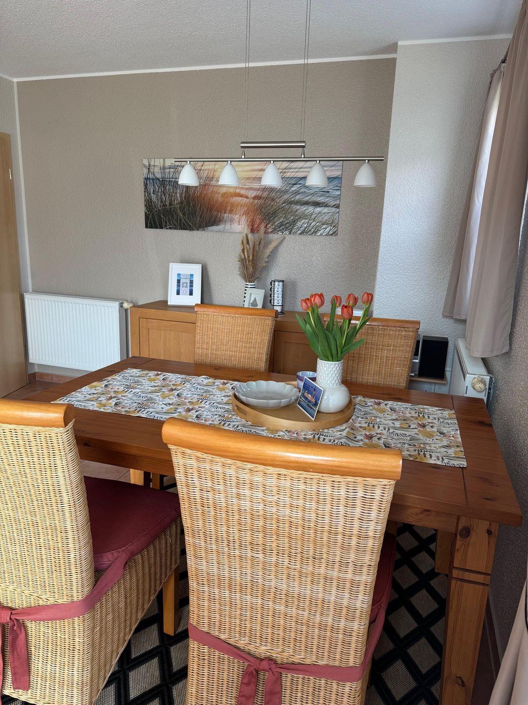 Die Ferienwohnung verfügt über ein stilvolles Schlafzimmer mit einem komfortablen Bett und einem harmonischen Laminatboden, der für eine einladende Atmosphäre sorgt. Das helle Wohnzimmer ist der perfekte Ort, um nach einem erlebnisreichen Tag zur Ruhe zu kommen. Hier finden Sie eine gemütliche Sofaecke, einen Esstisch für romantische Abendessen und einen Fernseher mit Kabelanschluss sowie einen DVD-Spieler. Für gemütliche Abende stehen Ihnen diverse Bücher, Spiele und eine HiFi-Anlage zur Verfügung.