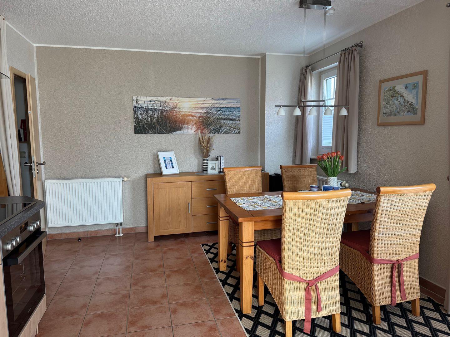 EG: Küche mit Esstisch, Kühlschrank mit Gefrierfach, Cerankochfeld, Kaffeemaschine