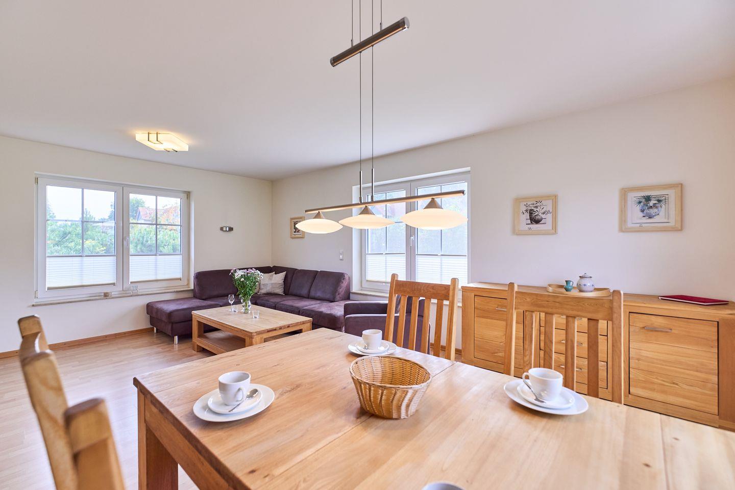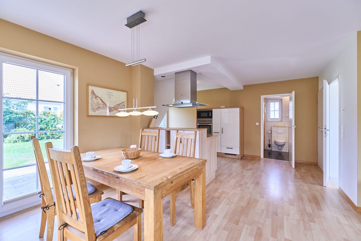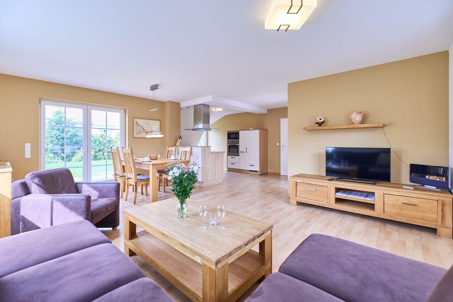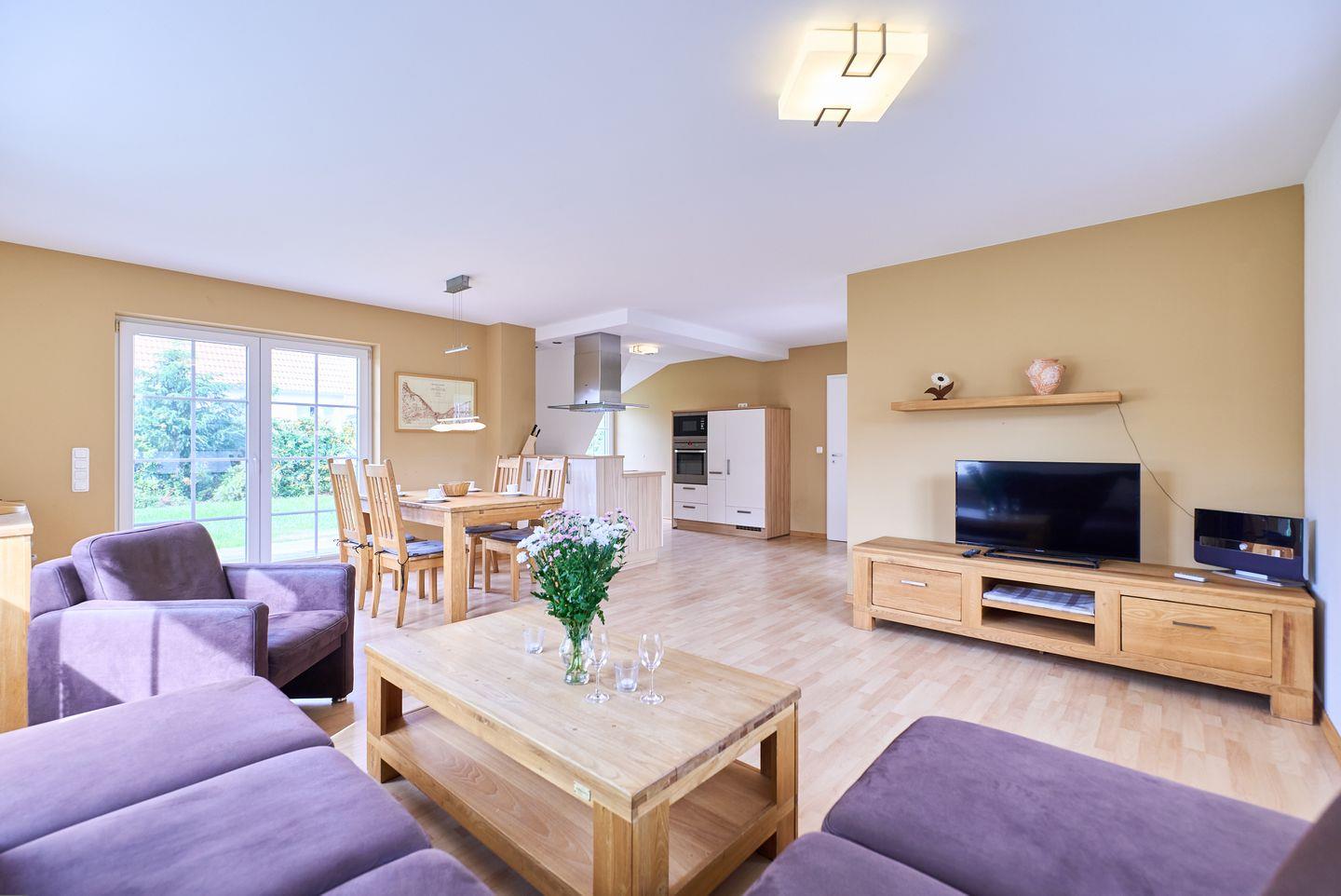 Das Herzstück des Hauses ist der offene Wohn- und Essbereich, der mit seiner hellen, freundlichen Atmosphäre einladend wirkt. Hier können Sie bei entspannten Stunden auf dem bequemen Sofa relaxen und Ihre Lieblingssendungen auf einem der zwei verfügbaren Fernseher genießen. Der angrenzende Essbereich mit einem großen Esstisch lädt dazu ein, gemeinsam zu speisen und gesellige Abende zu verbringen.