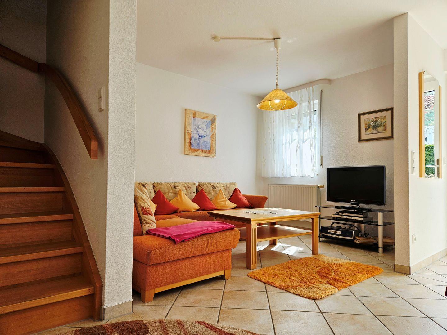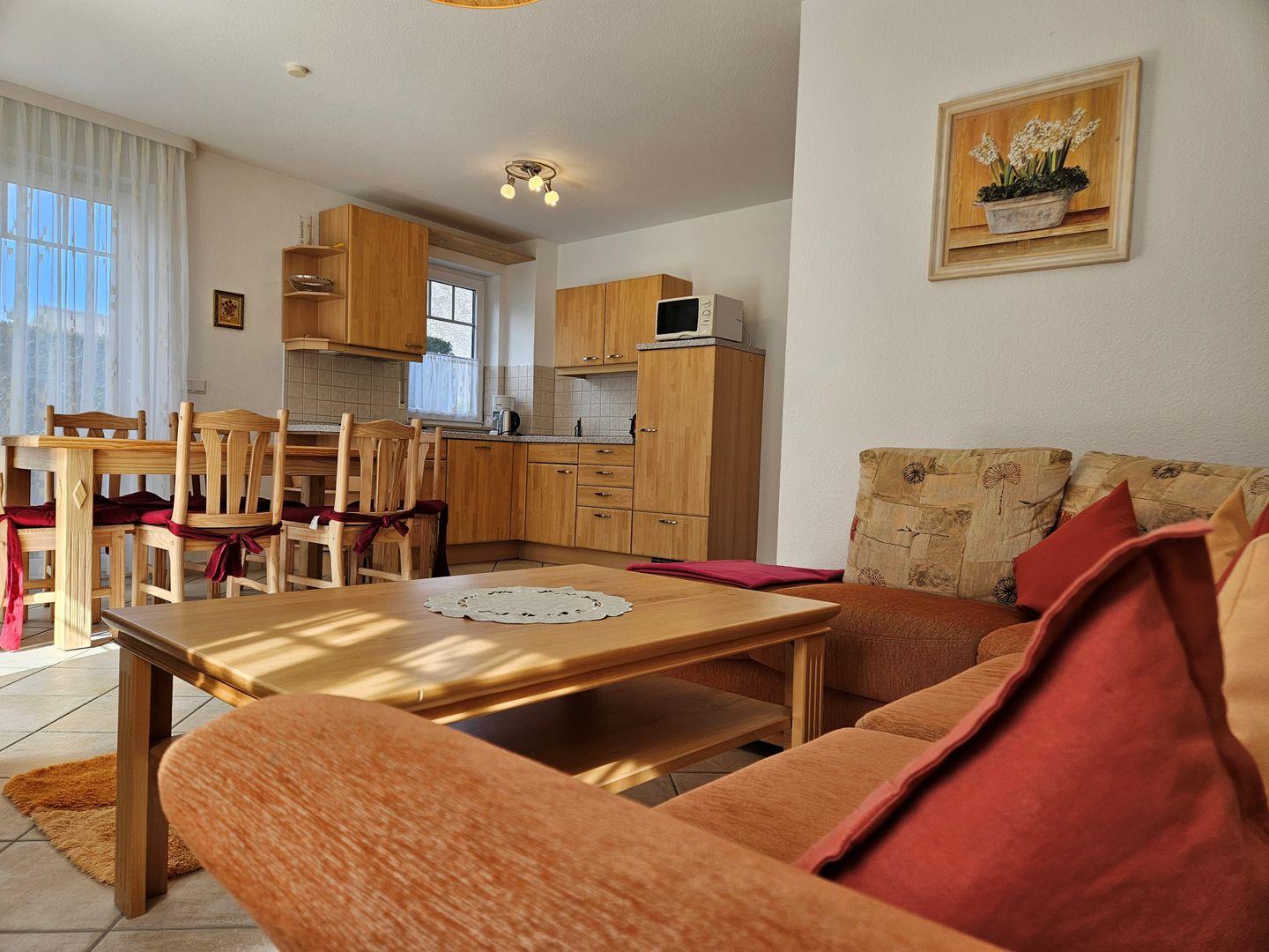 Mit einer großzügigen Fläche von 64 m² bietet die Ferienwohnung ausreichend Platz für bis zu 4 Personen. Sie verfügt über zwei gemütliche Schlafzimmer, die mit Teppichboden ausgelegt sind und einen angenehmen Schlafkomfort garantieren. Das Wohnzimmer, das sich durch seine offenen Gestaltung zur Küche auszeichnet, bietet mit einer Sofaecke und einem Esstisch die perfekte Umgebung zum Entspannen und geselligen Beisammensein. Hier können Sie den Abend bei einem guten Film auf dem Fernseher oder einem DVD-Spieler ausklingen lassen. Zusätzliche Extras wie Bettwäsche und Handtücher (diese sind NICHT in Ihrer Buchung enthalten),können über unsere Gäste-App dazu gebucht werden.